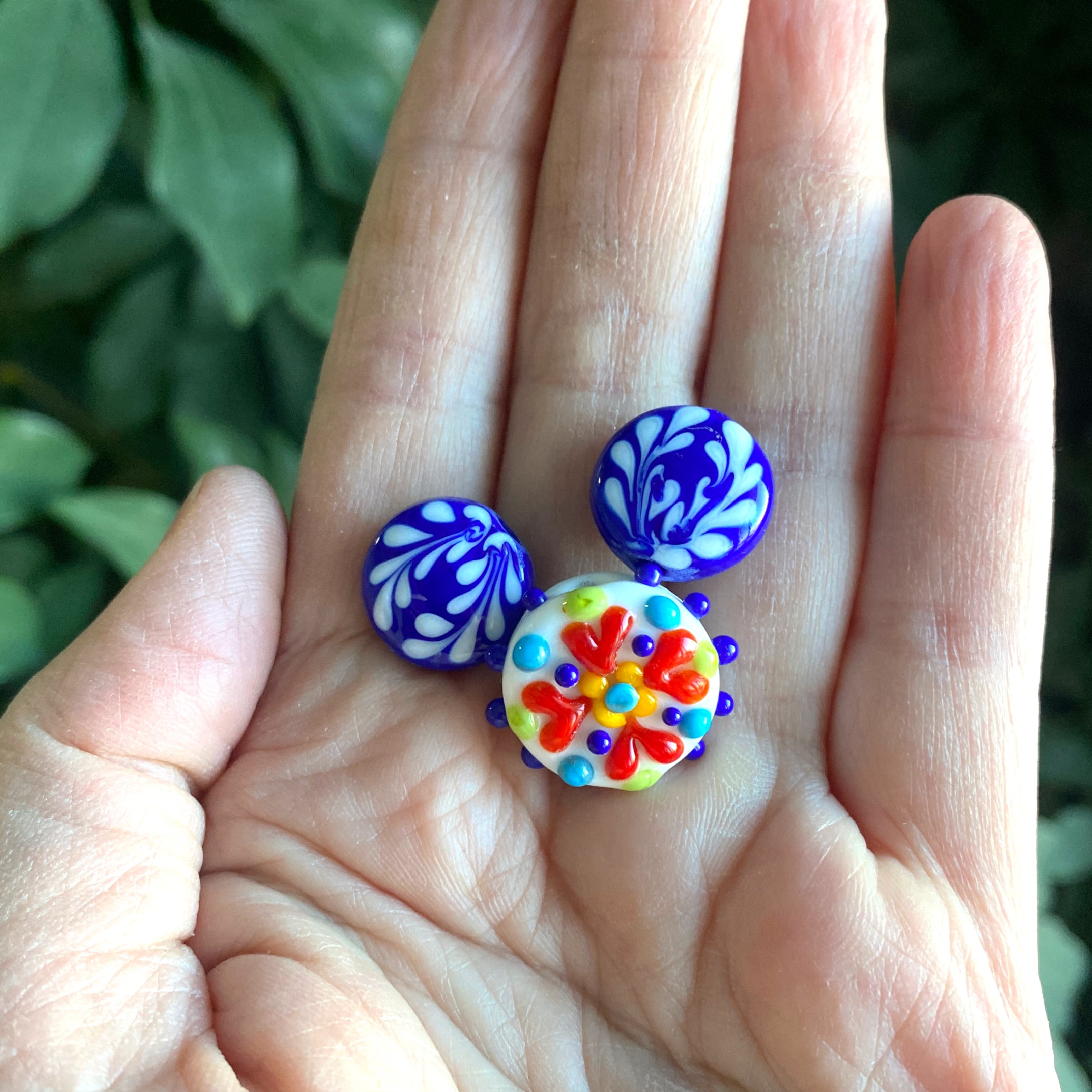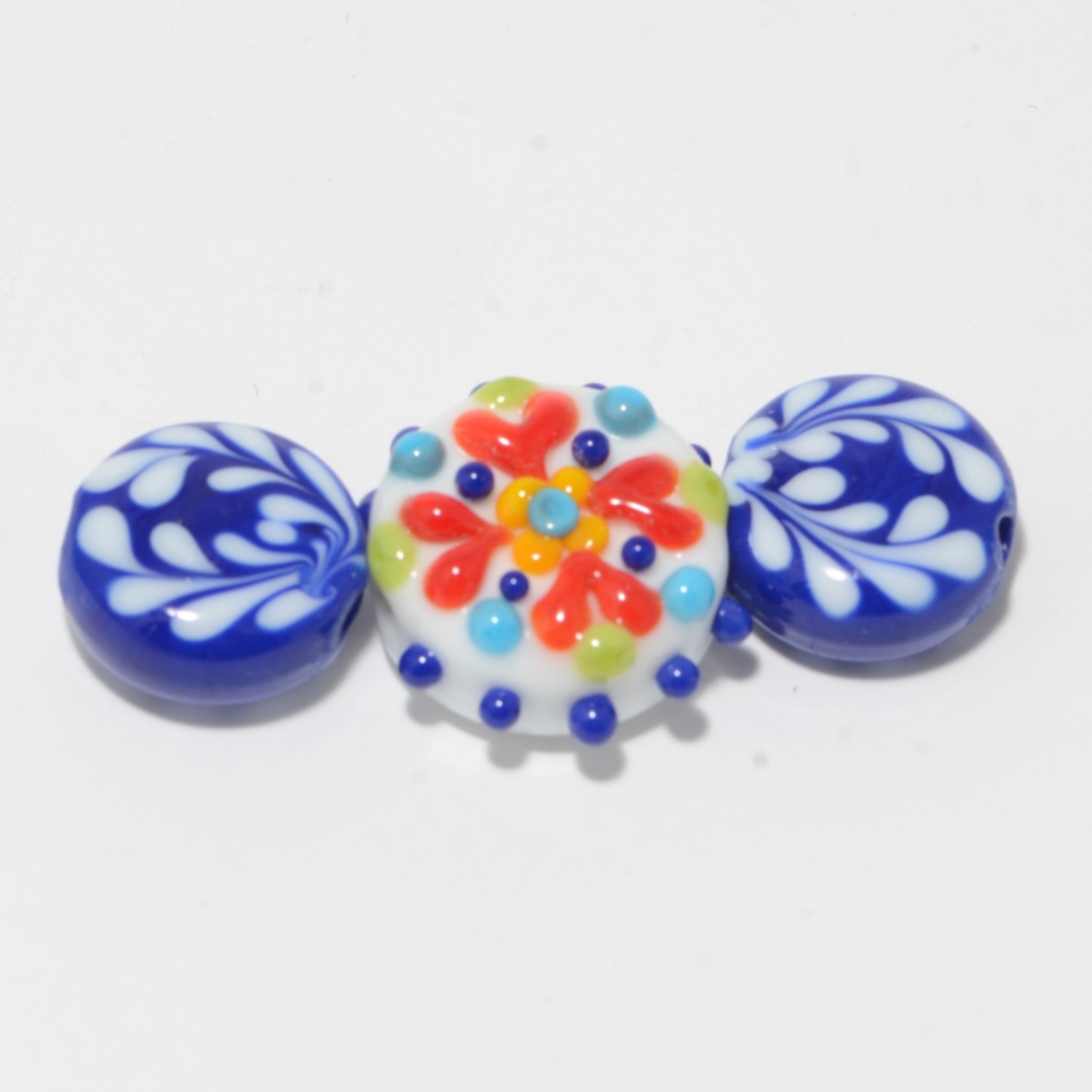 This is a set with a decorated focal and two straight-sided lentil accent beads with a total strand length of 4.5 cm. The focal is smooth on the back and the accents are decorated on both sides. These beads were inspired by the colorful pottery and embroidery designs on my recent trip to Puerto Vallarta.
