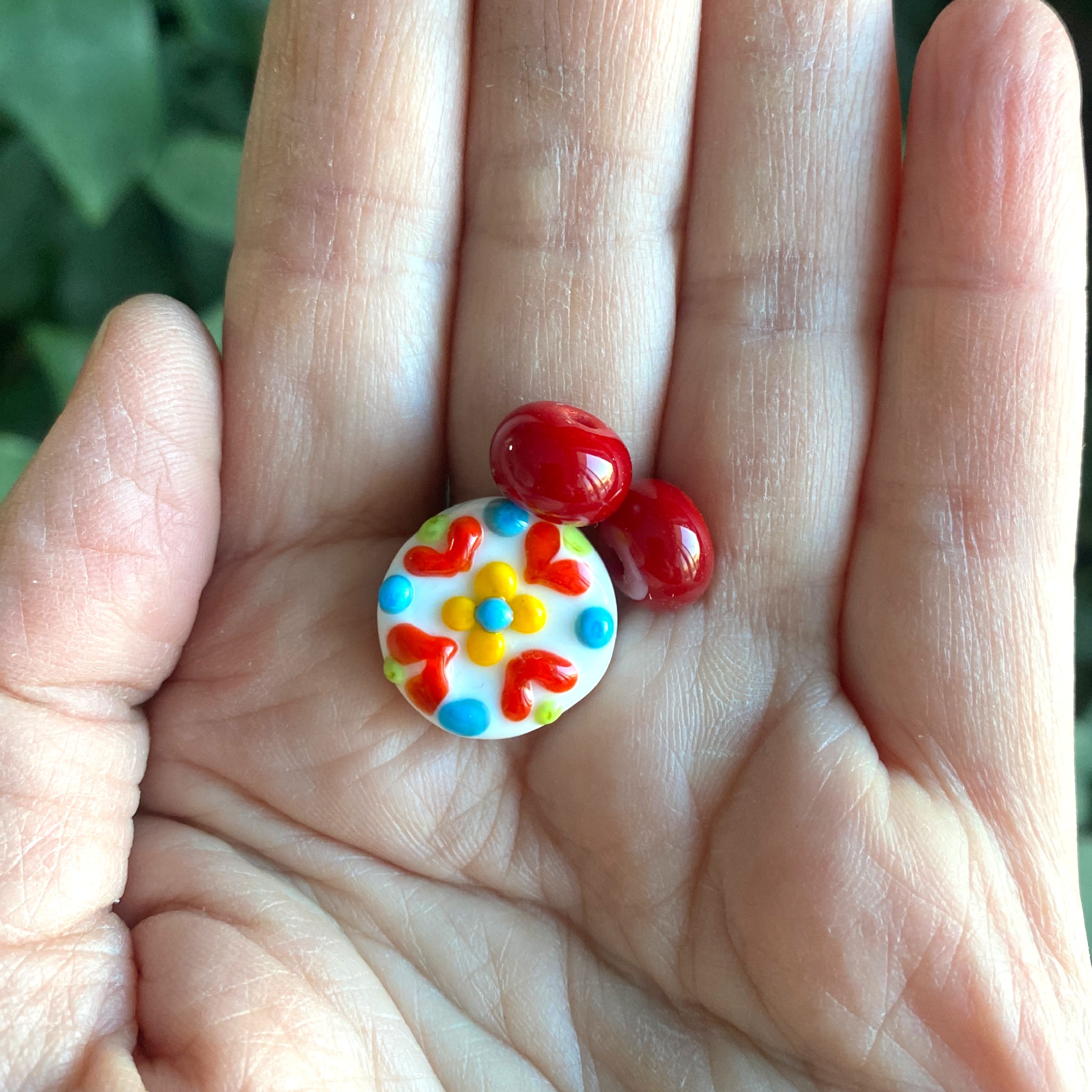 This is a textured decorated focal with two round accent beads with a total strand length of 3.25 cm. The focal is smooth on the back in order to sit level.  These beads  were inspired by the colorful pottery and embroidery designs on my recent trip to Puerto Vallarta.