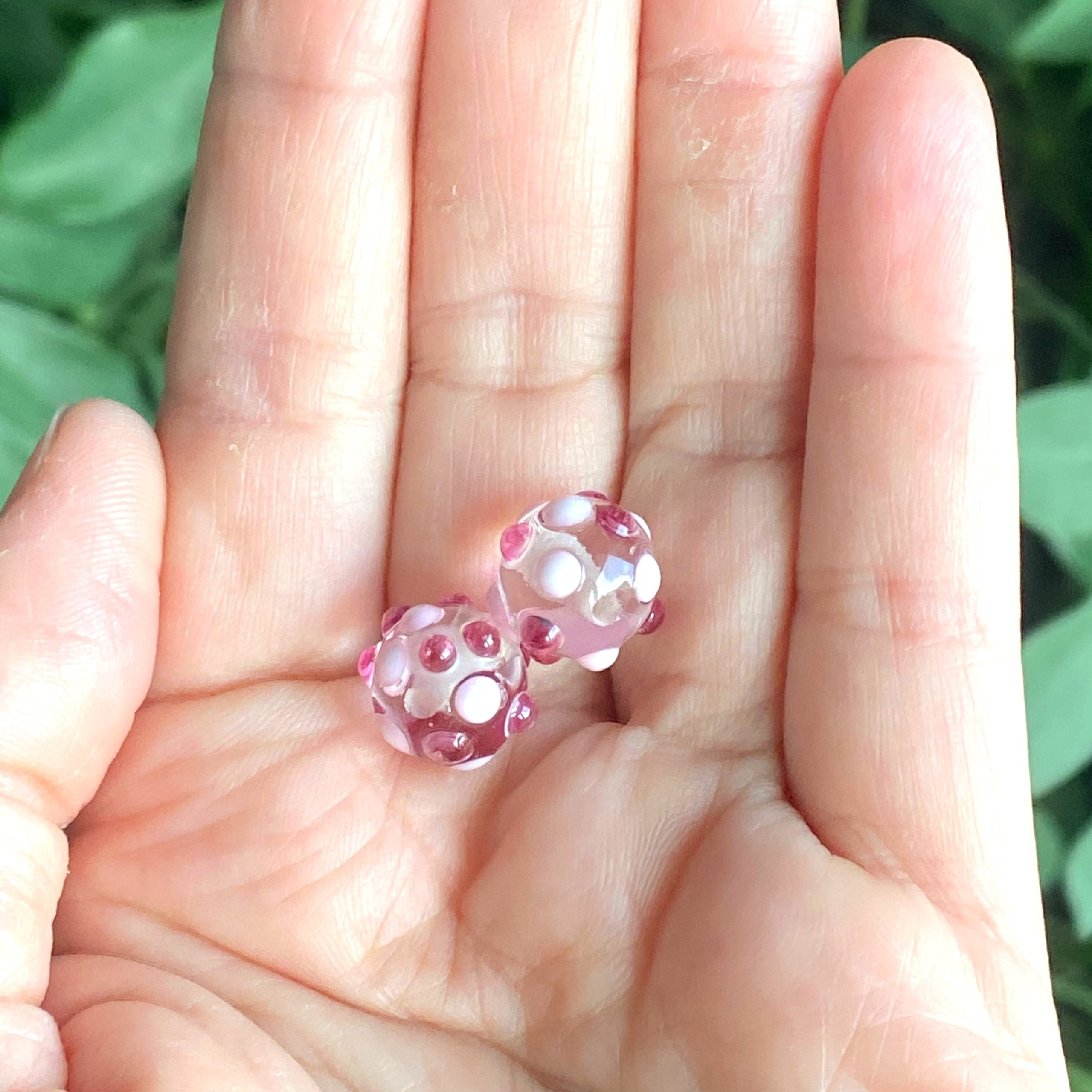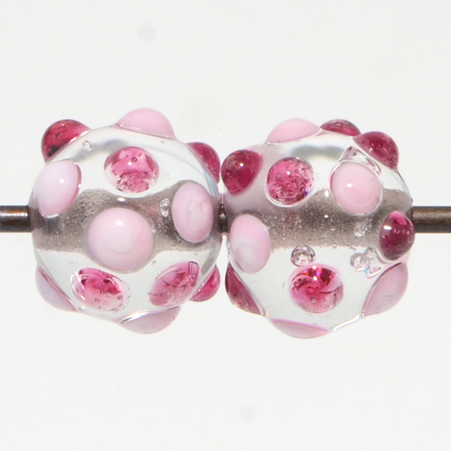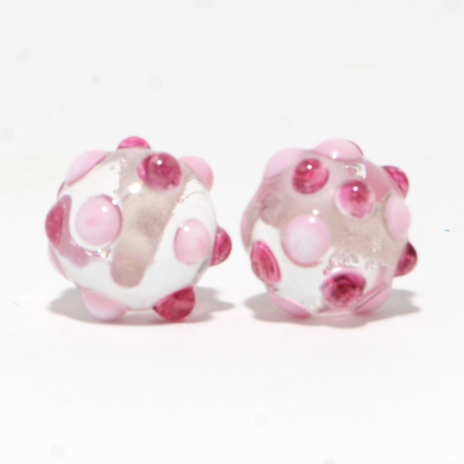 This is pair of ~11.5 mm round beads are made from soft glass on 1/16” mandrels and properly annealed (flame to kiln) for durability. Each bead weighs roughly 2 grams. The crystal clear interiors have been decorated with a pattern of raised pink dots for sparkle and texture.
