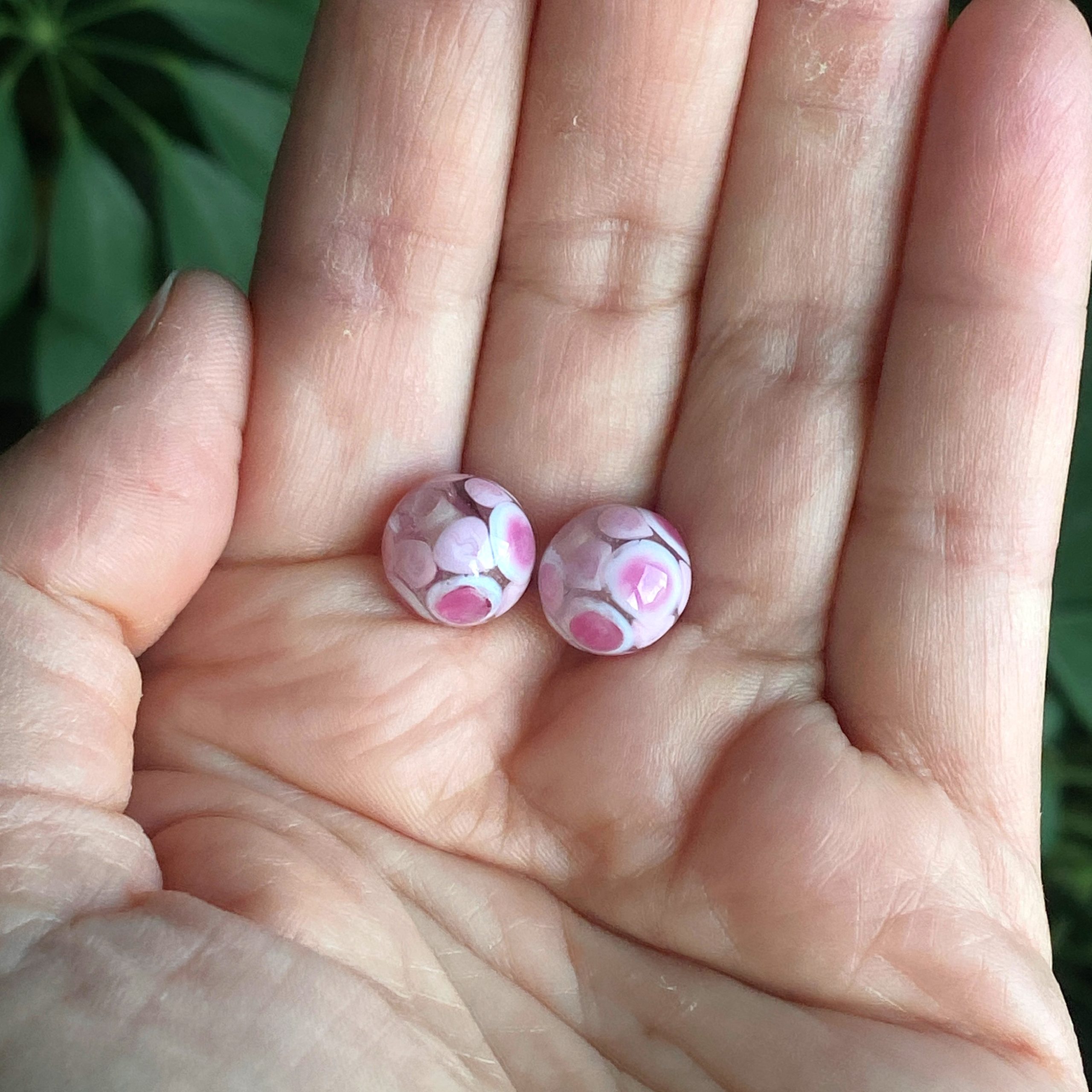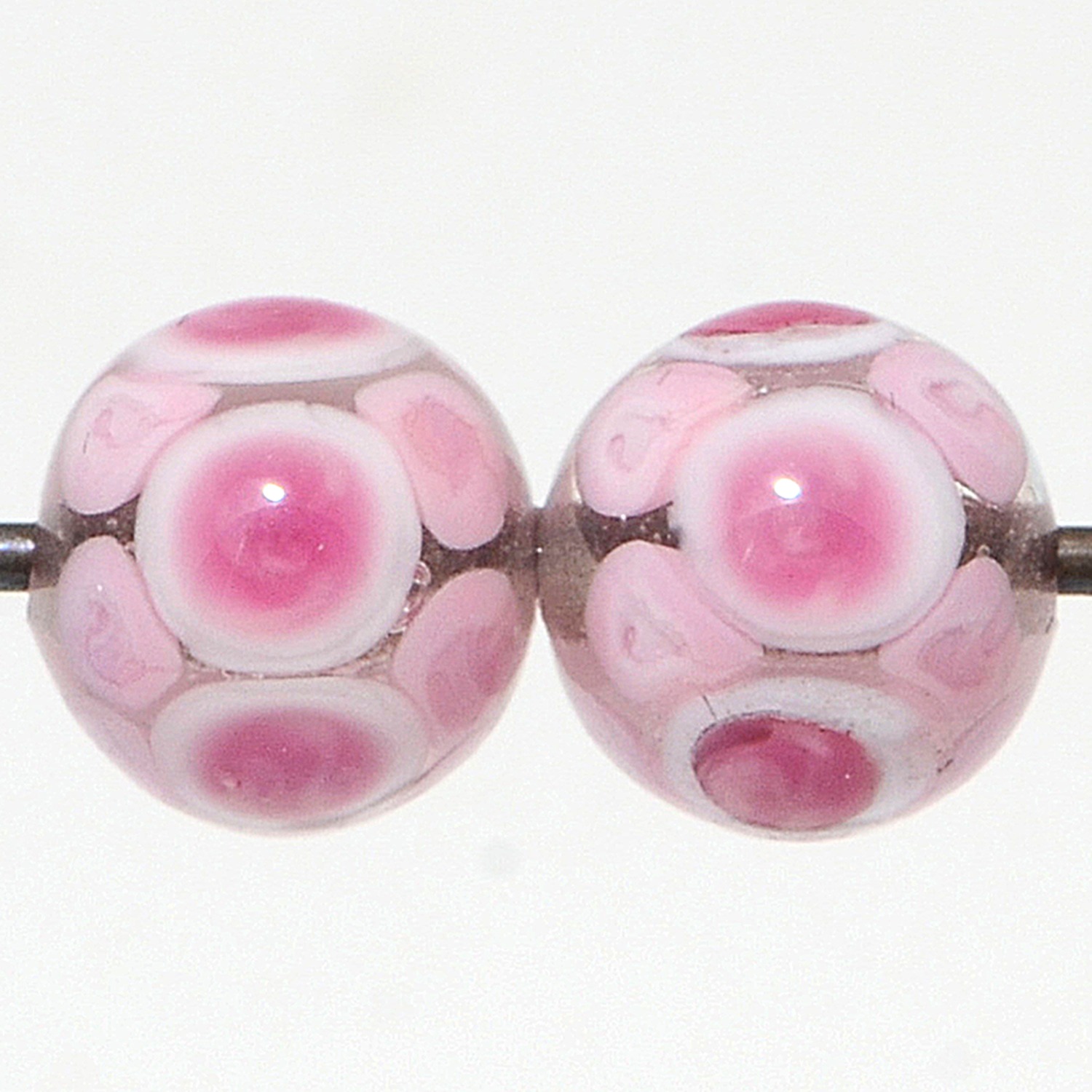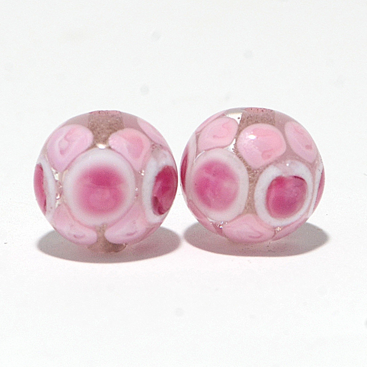 This is pair of ~11.5 mm round beads are made from soft glass on 1/16” mandrels and properly annealed (flame to kiln) for durability. Each bead weighs roughly 2 grams. The crystal clear interiors have been decorated with a pattern of melted in pink dots.