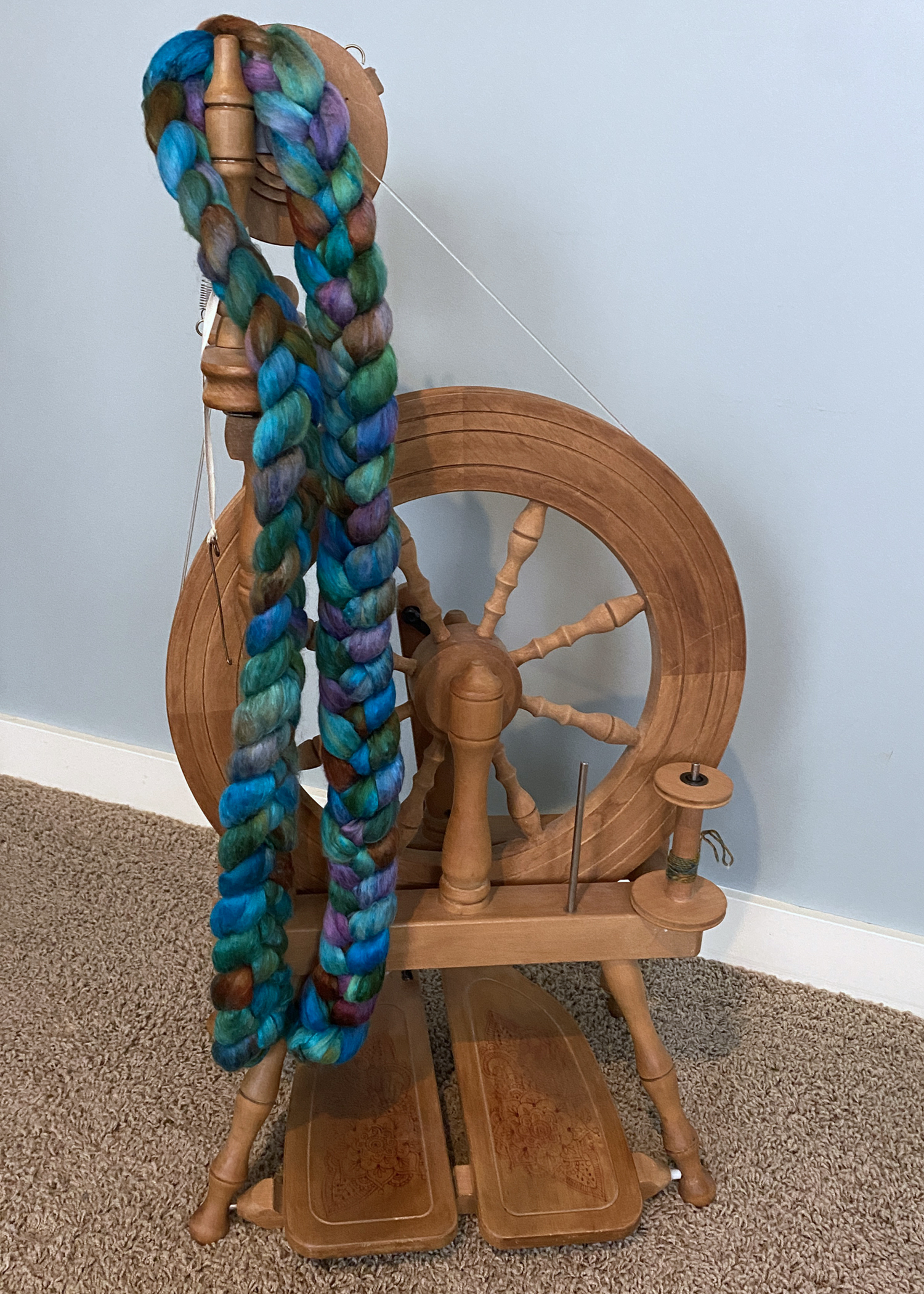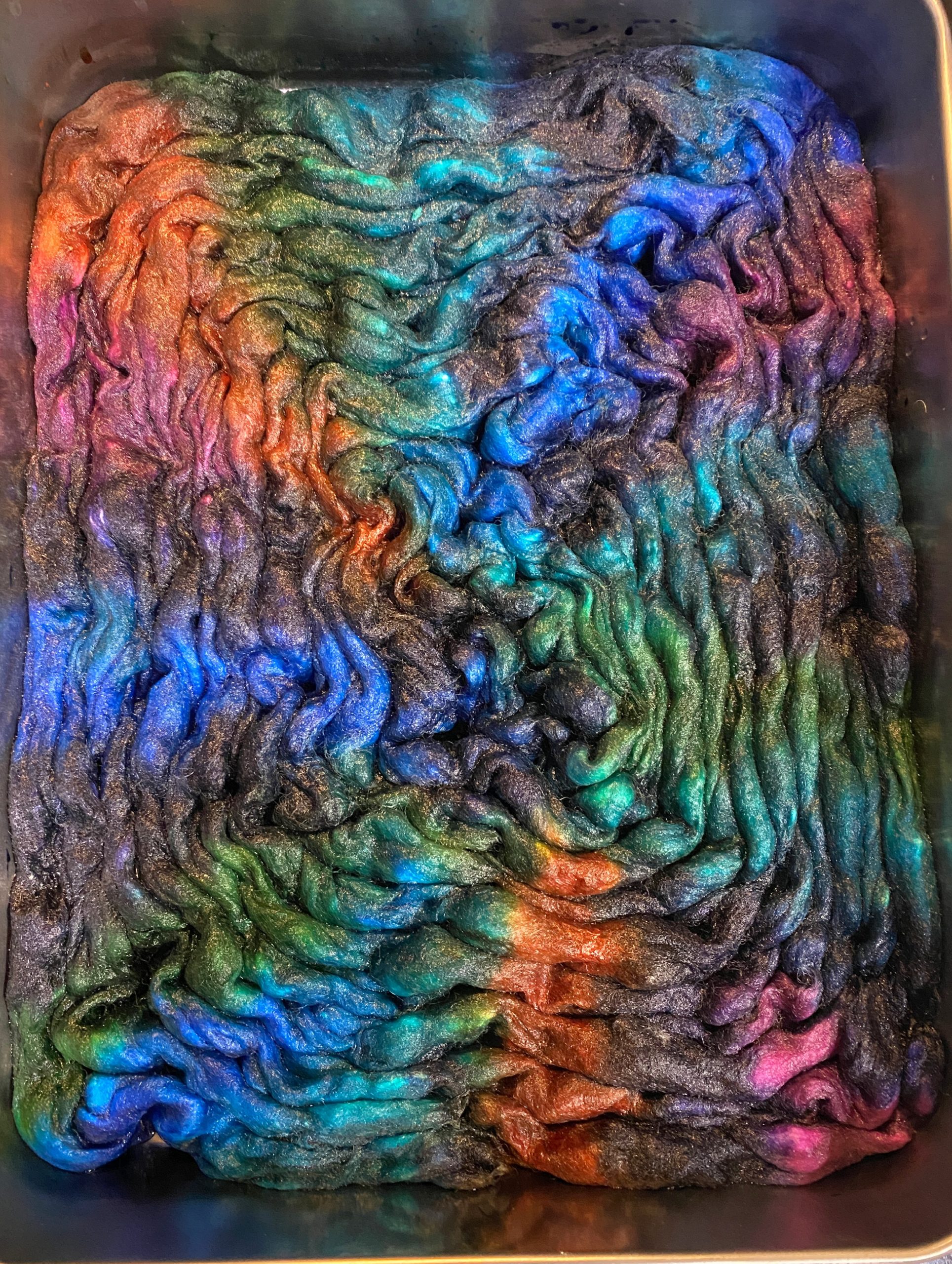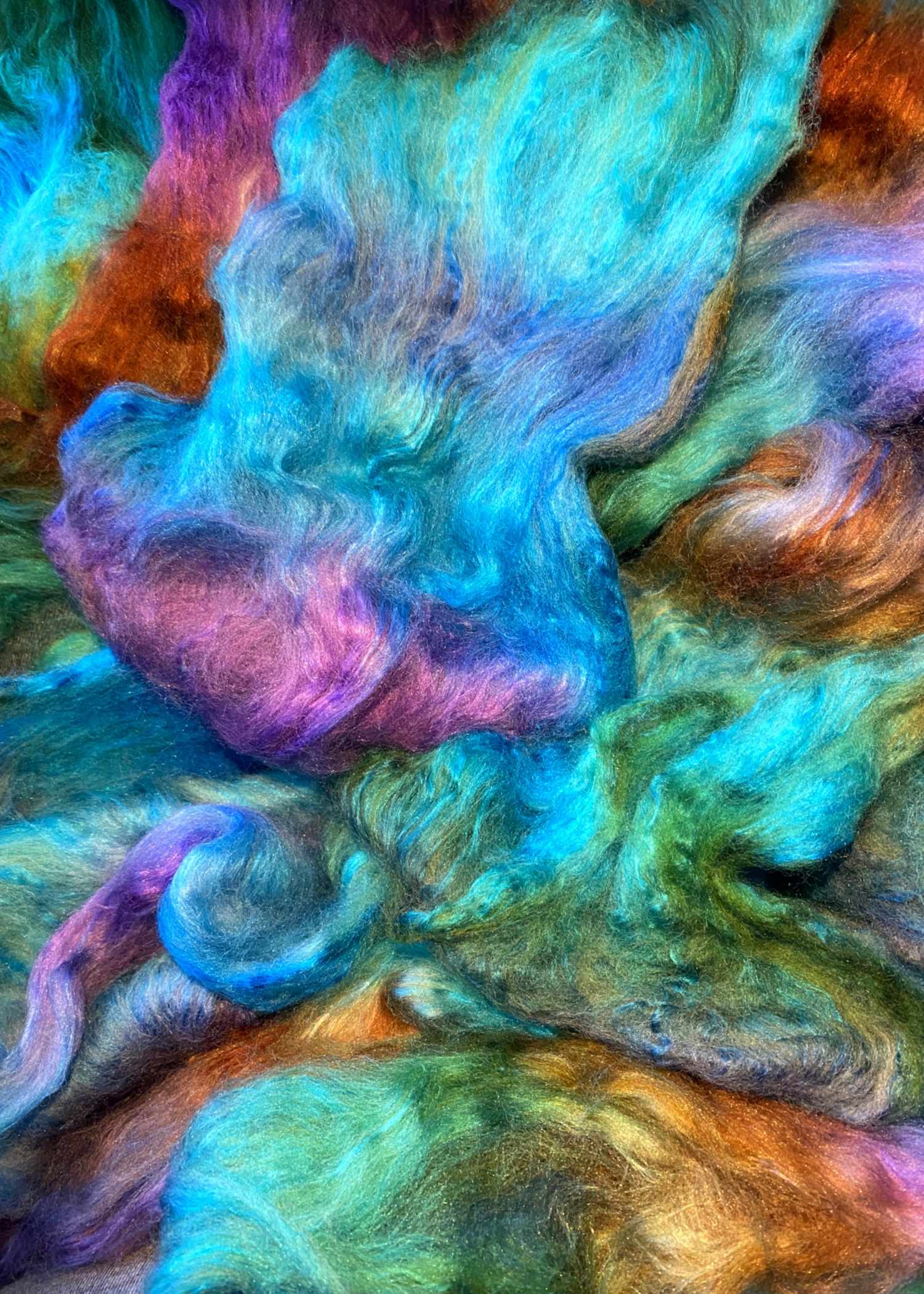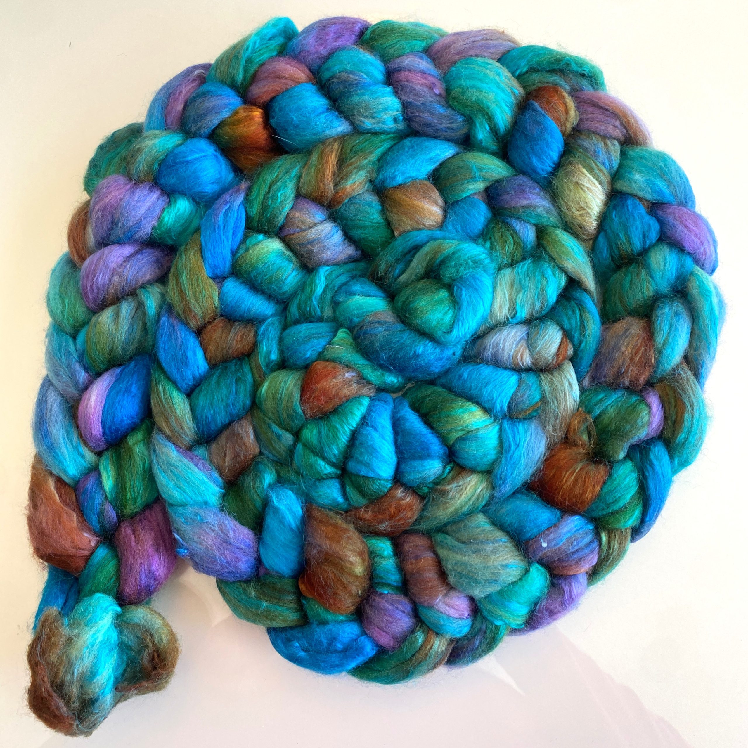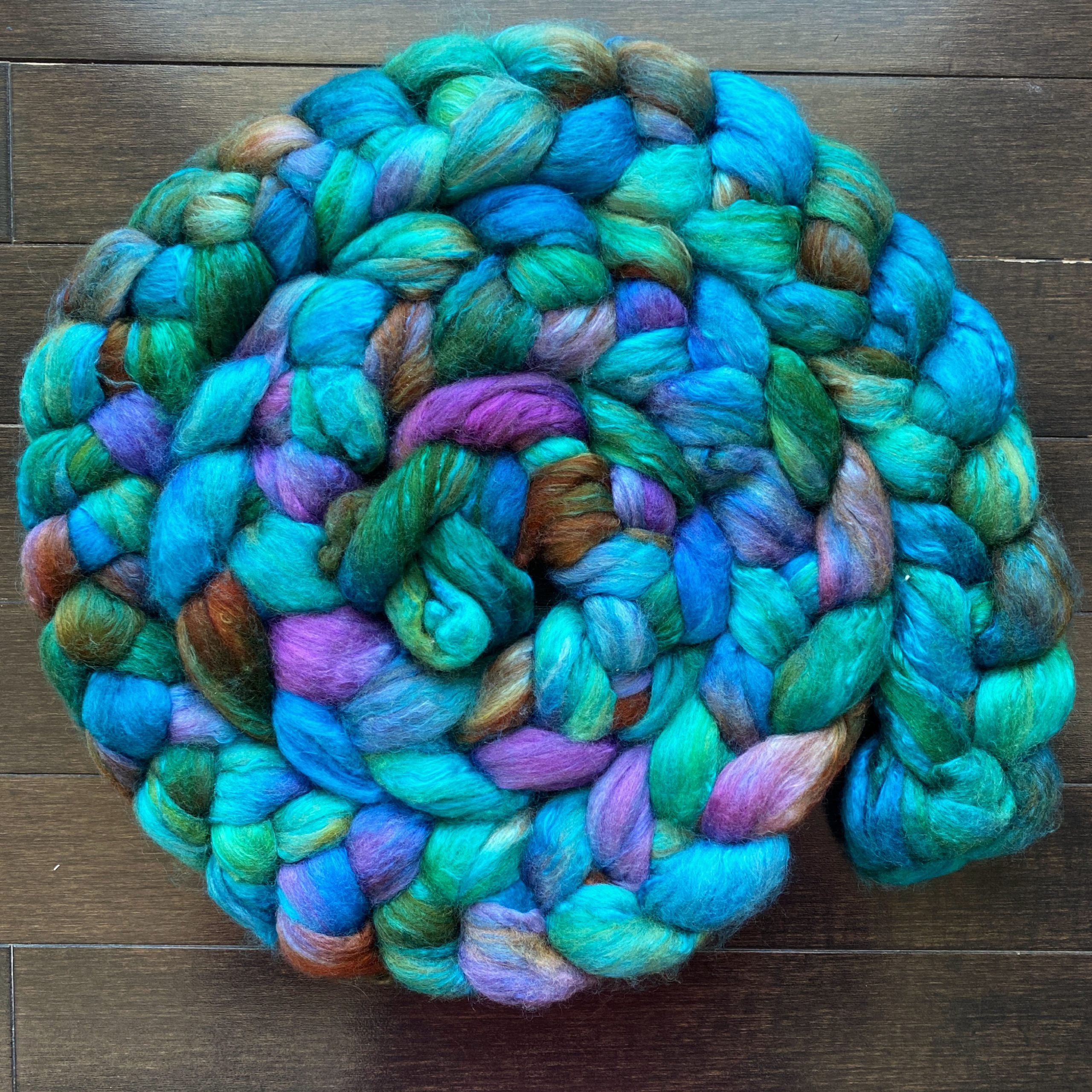 Hand dyed roving in shades of forest green and rust brown with lustrous bright aqua and a touch of bright purple. This colorway was inspired by my memories of playing Zelda and the forest adventures of little Link. Hand dyed on a luxury merino and silk blend for the warmth of wool with a touch of silky shimmer. You can choose to spin this roving as is for a yarn with a long organic color changes or split it lengthwise before spinning for multiple shorter color repeats. This fiber also felts very well and makes easy and exceptional nuno-felted scarves with character and sheen with all the colors built right in. All dyes have been heat set for color fastness and the roving has been “refloofed” after dyeing for ease of drafting.