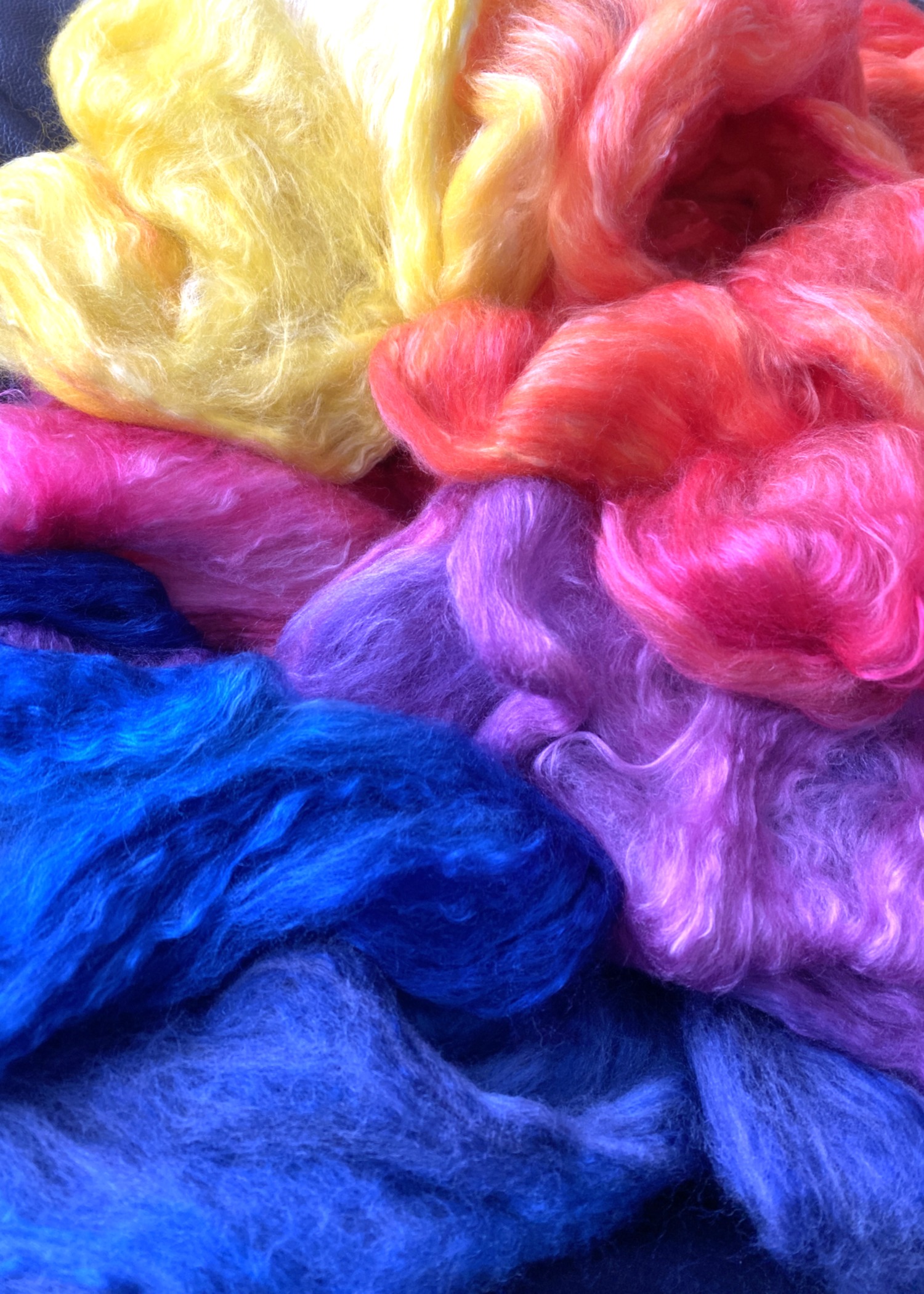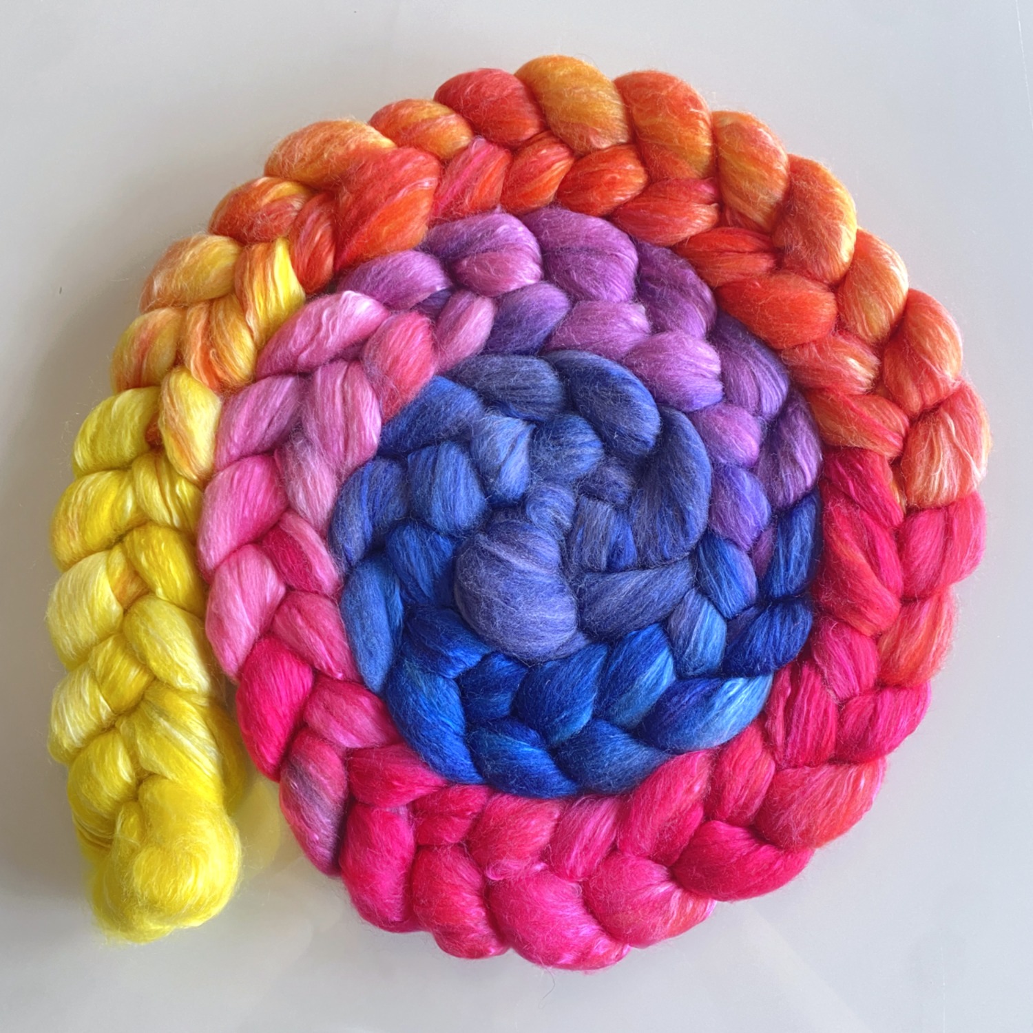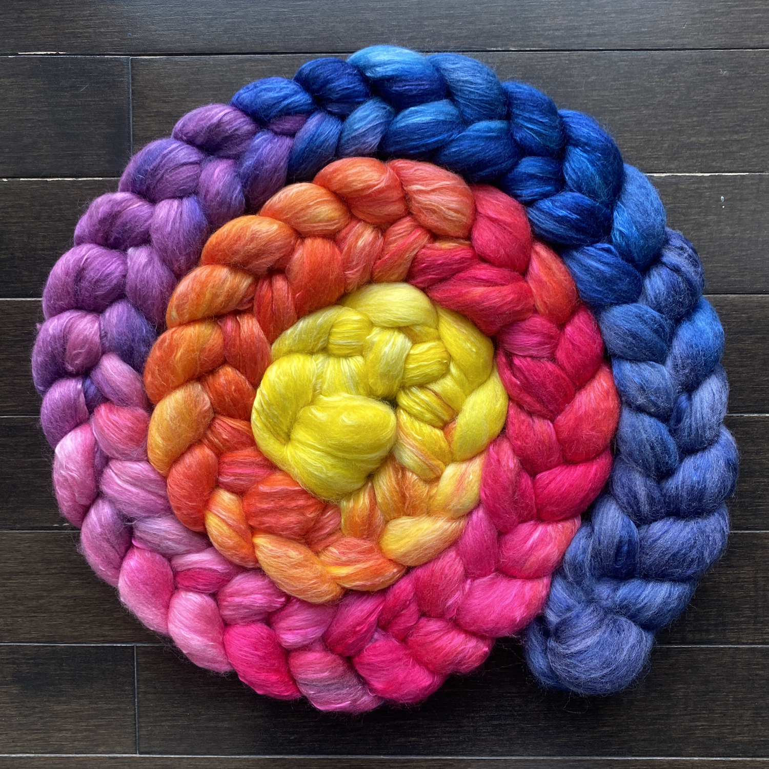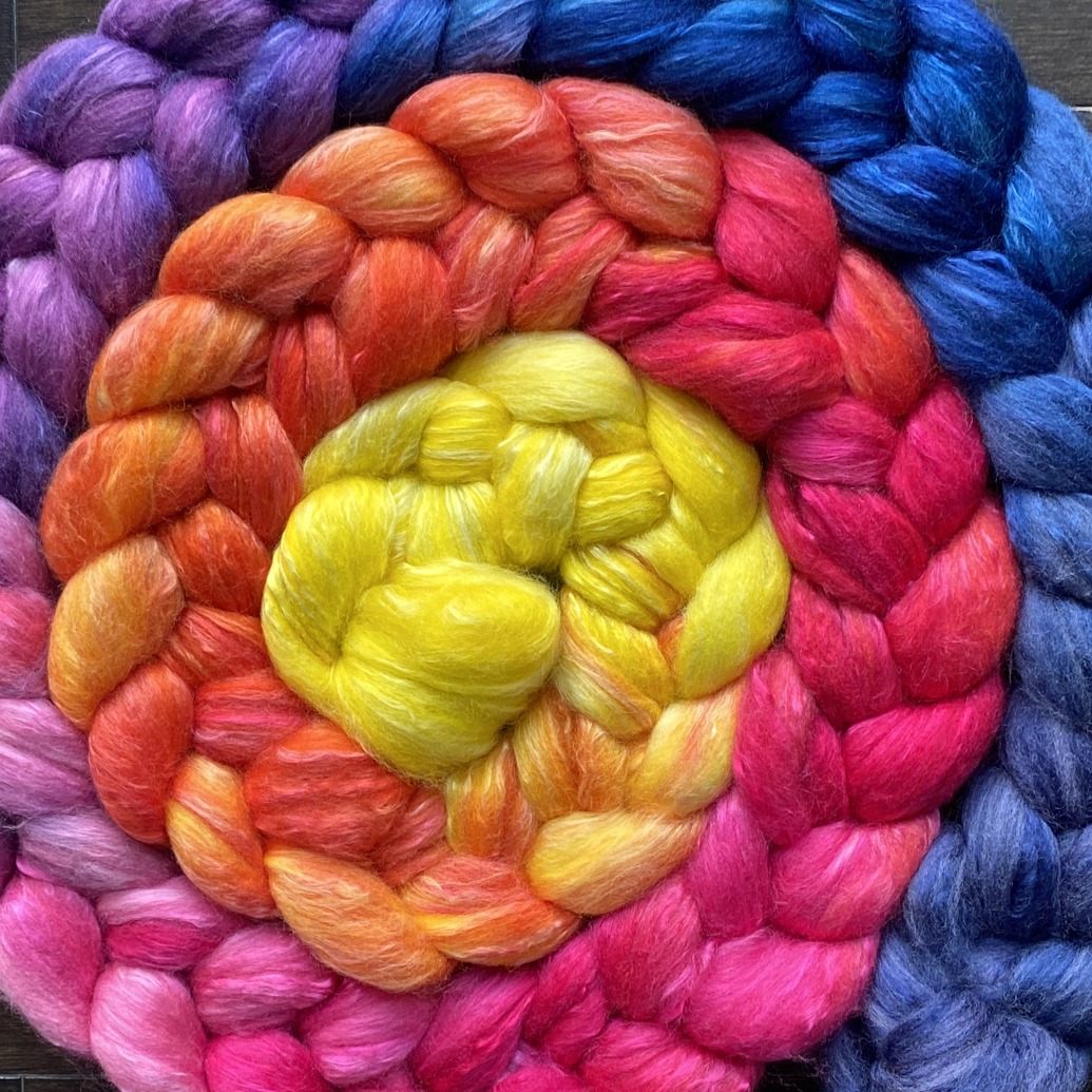 A stunning fade from sunset reds and yellows into a dark navy background. This colorway has been hand dyed on a luxury merino and silk blend for the warmth of wool with a touch of silky shimmer. You can choose to spin this roving as is for a yarn with a long organic color changes or split it lengthwise before spinning for multiple shorter color repeats. This fiber also felts very well and makes easy and exceptional nuno-felted scarves with character and sheen with all the colors built right in. All dyes have been heat set for color fastness and the roving has been “refloofed” after dyeing for ease of drafting.