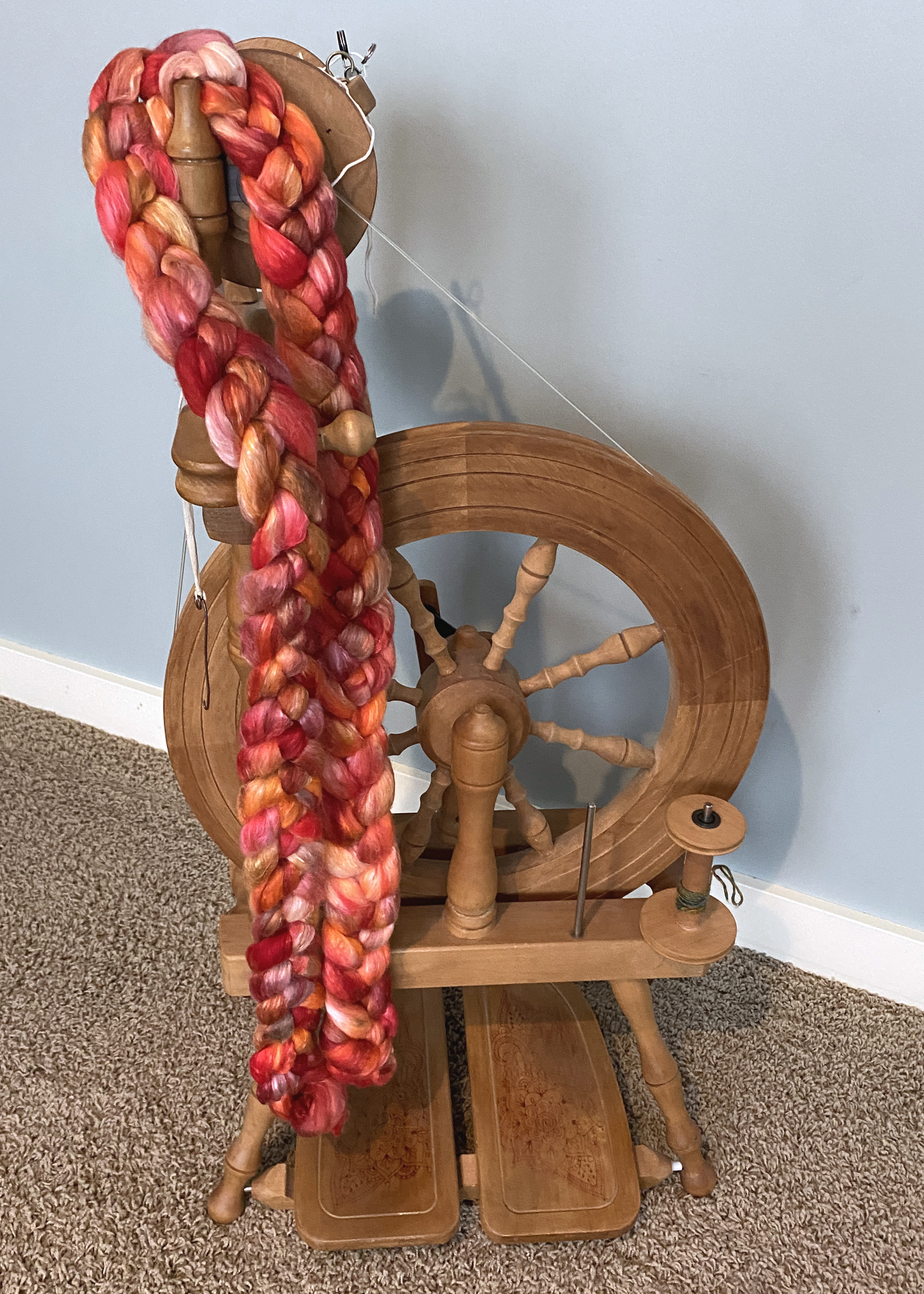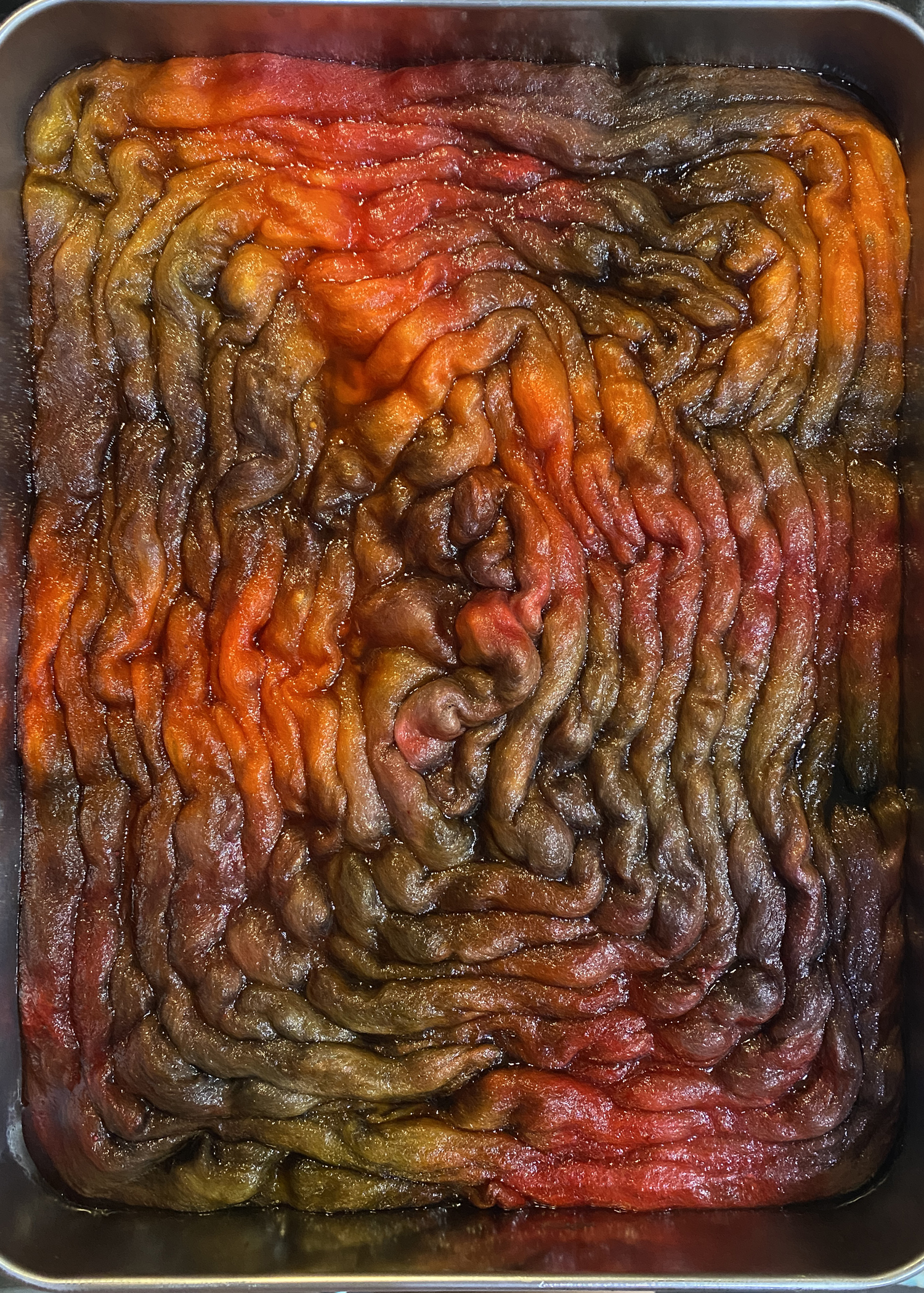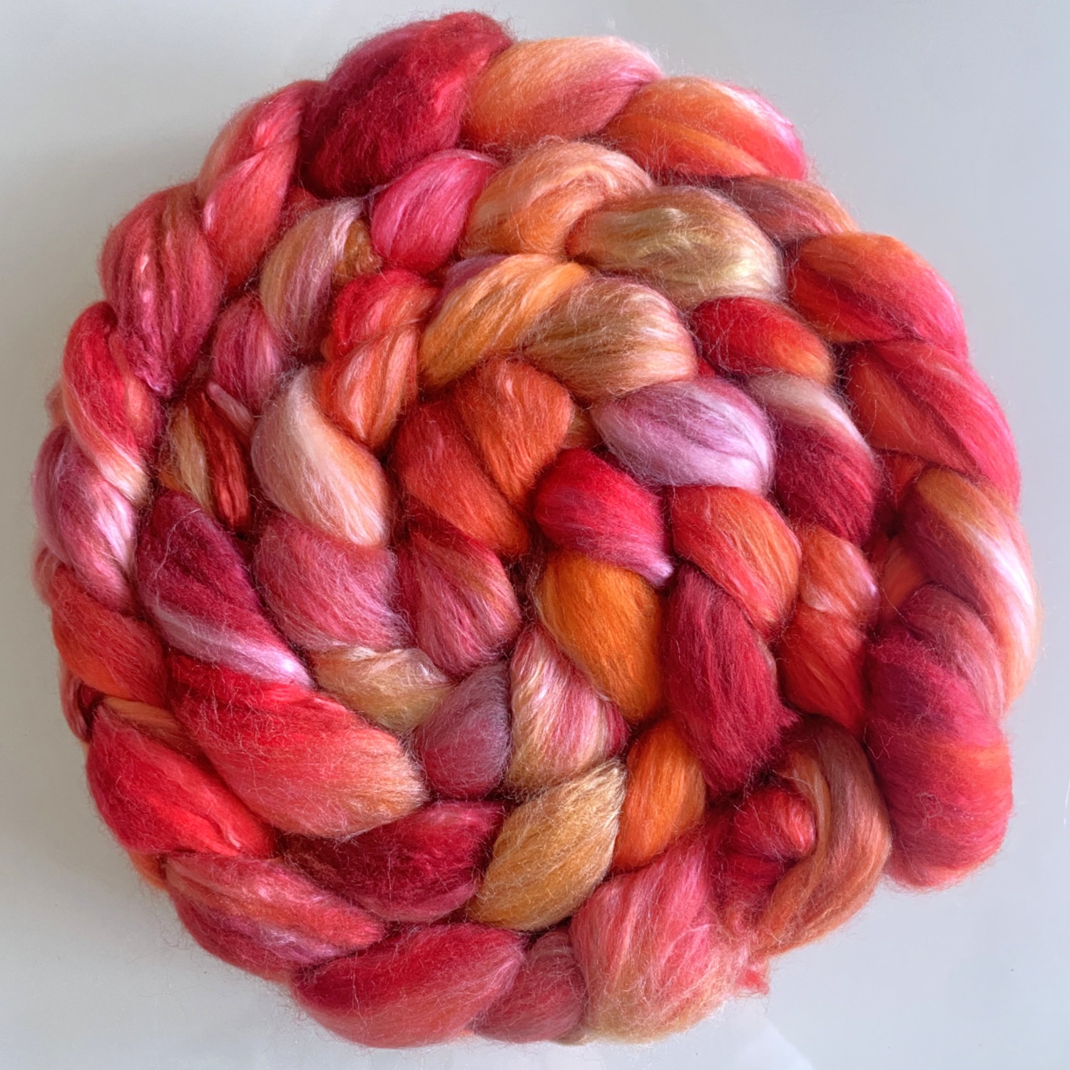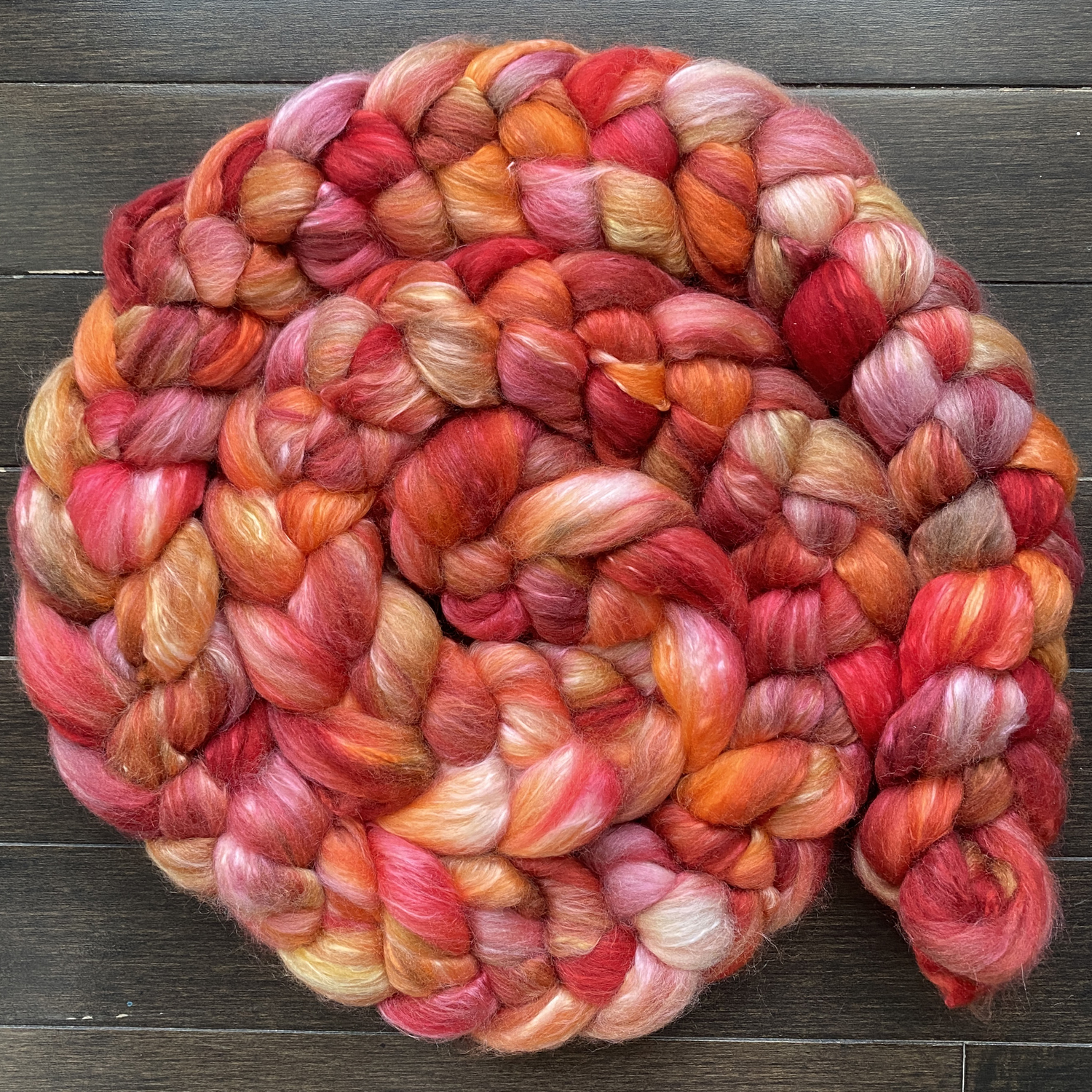 Warm and rich autumn reds, golds and browns. Hand dyed on a luxury merino and silk blend for the warmth of wool with a touch of silky shimmer. You can choose to spin this roving as is for a yarn with a long organic color changes or split it lengthwise before spinning for multiple shorter color repeats. This fiber also felts very well and makes easy and exceptional nuno-felted scarves with character and sheen with all the colors built right in. All dyes have been heat set for color fastness and the roving has been “refloofed” after dyeing for ease of drafting.
