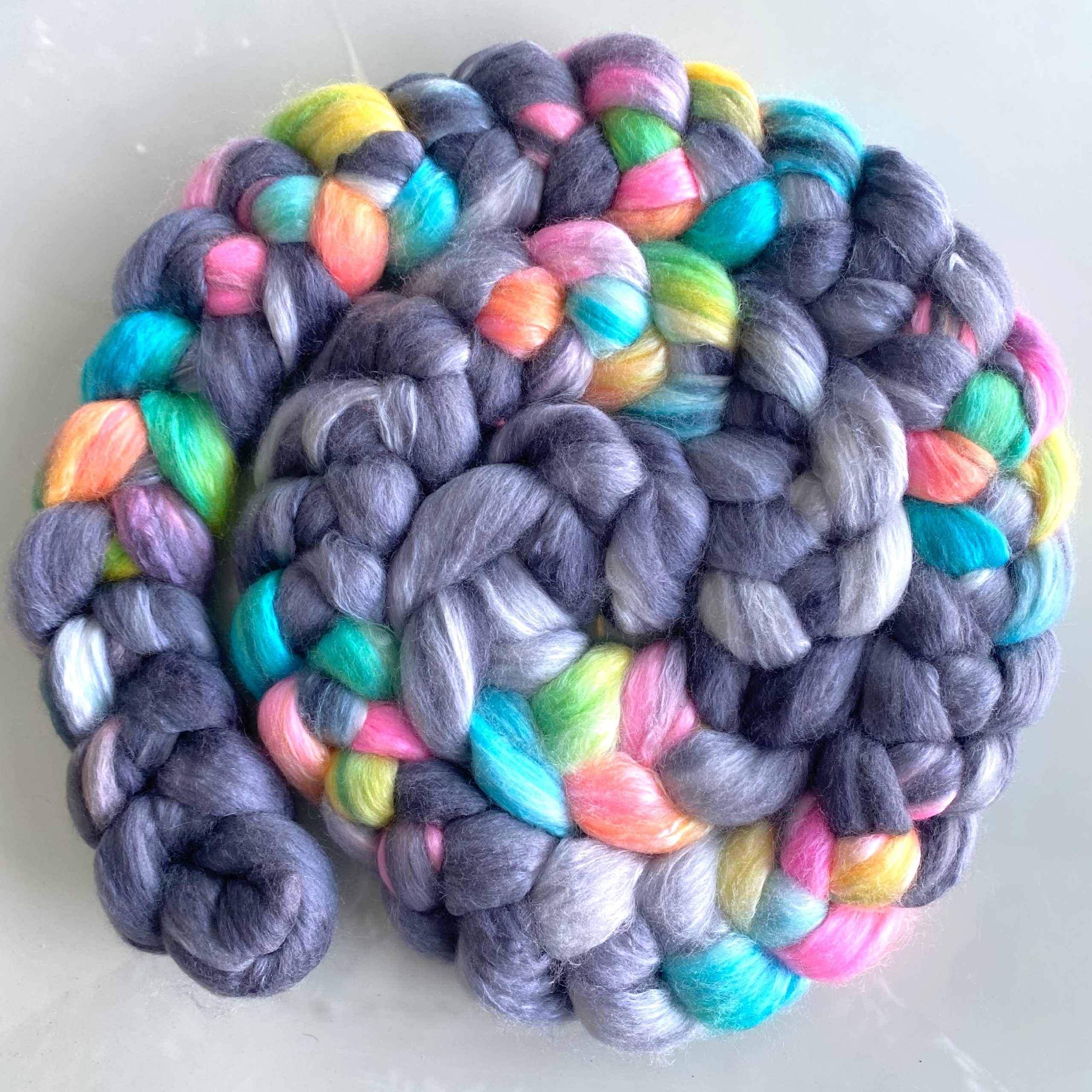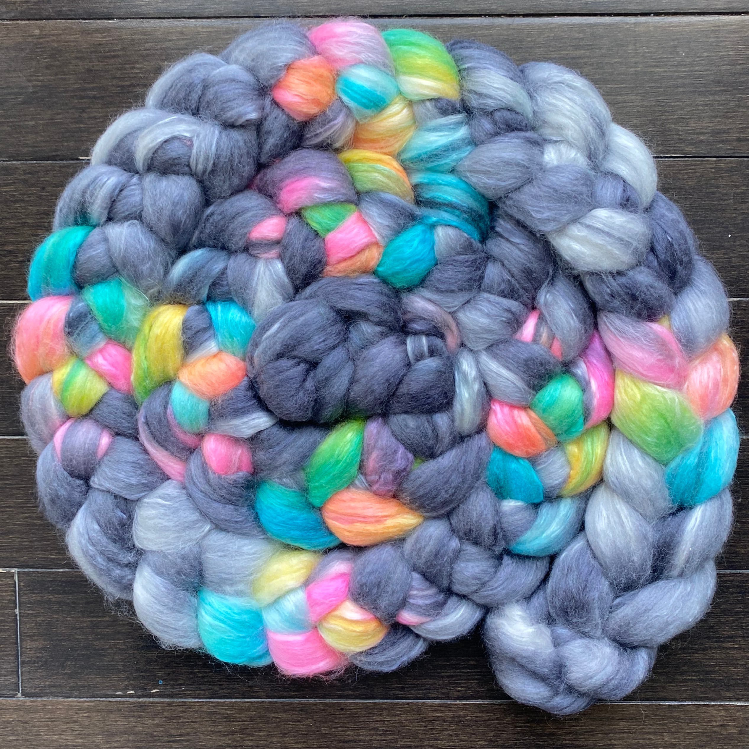 Hand dyed roving with bright rainbow sections interspersed in a base of mixed greys.  Hand dyed on a luxury merino and silk blend for the warmth of wool with a touch of silky shimmer.  You can choose to spin this roving as is for a yarn with a long organic color changes or split it lengthwise before spinning for multiple shorter color repeats.  This fiber also felts very well and makes easy and exceptional nuno-felted scarves with all the colors built right in.