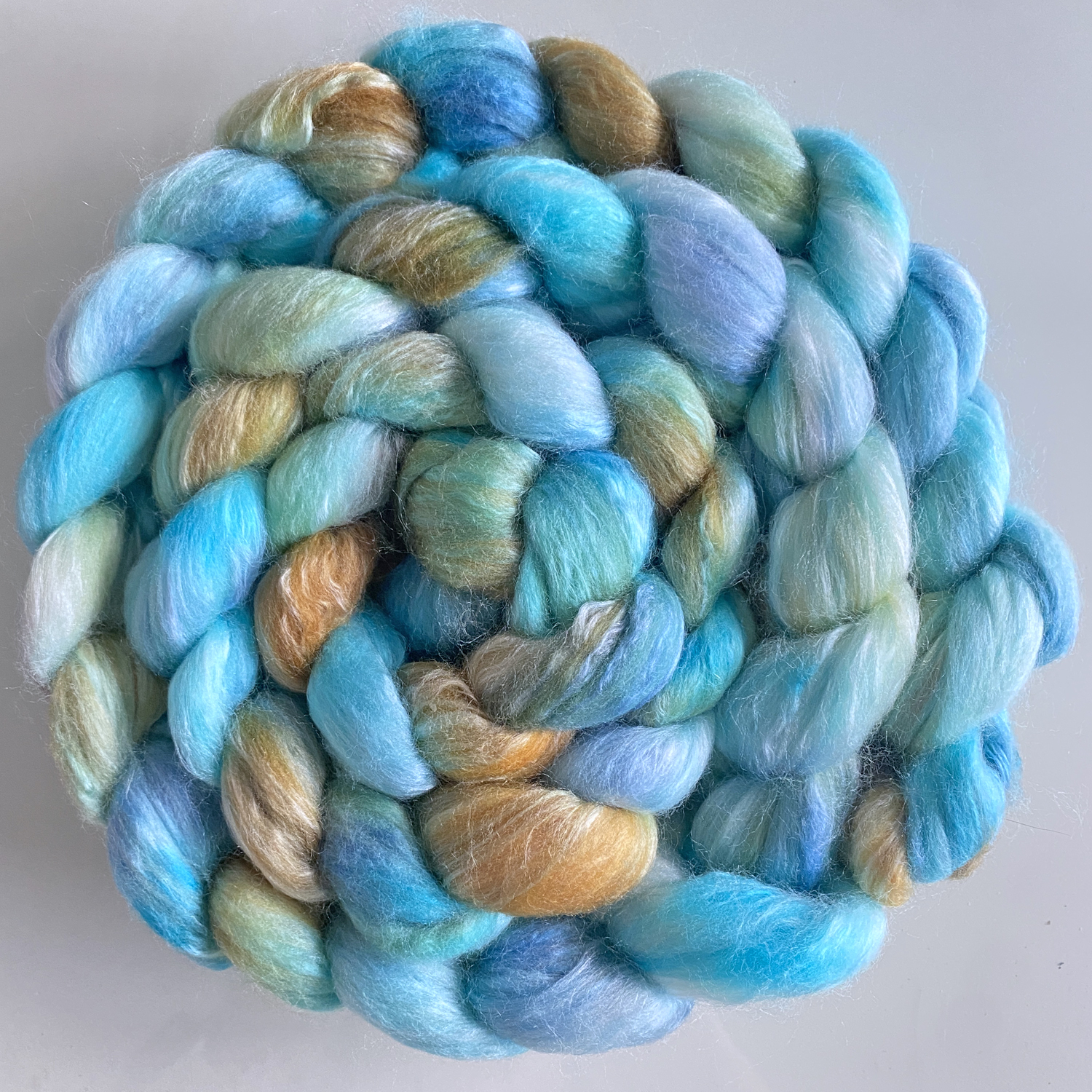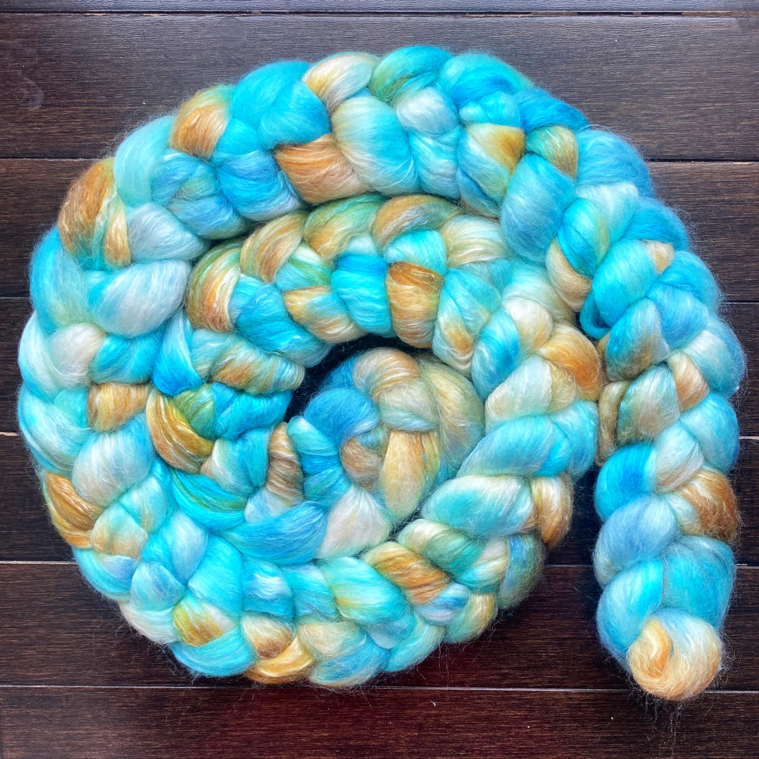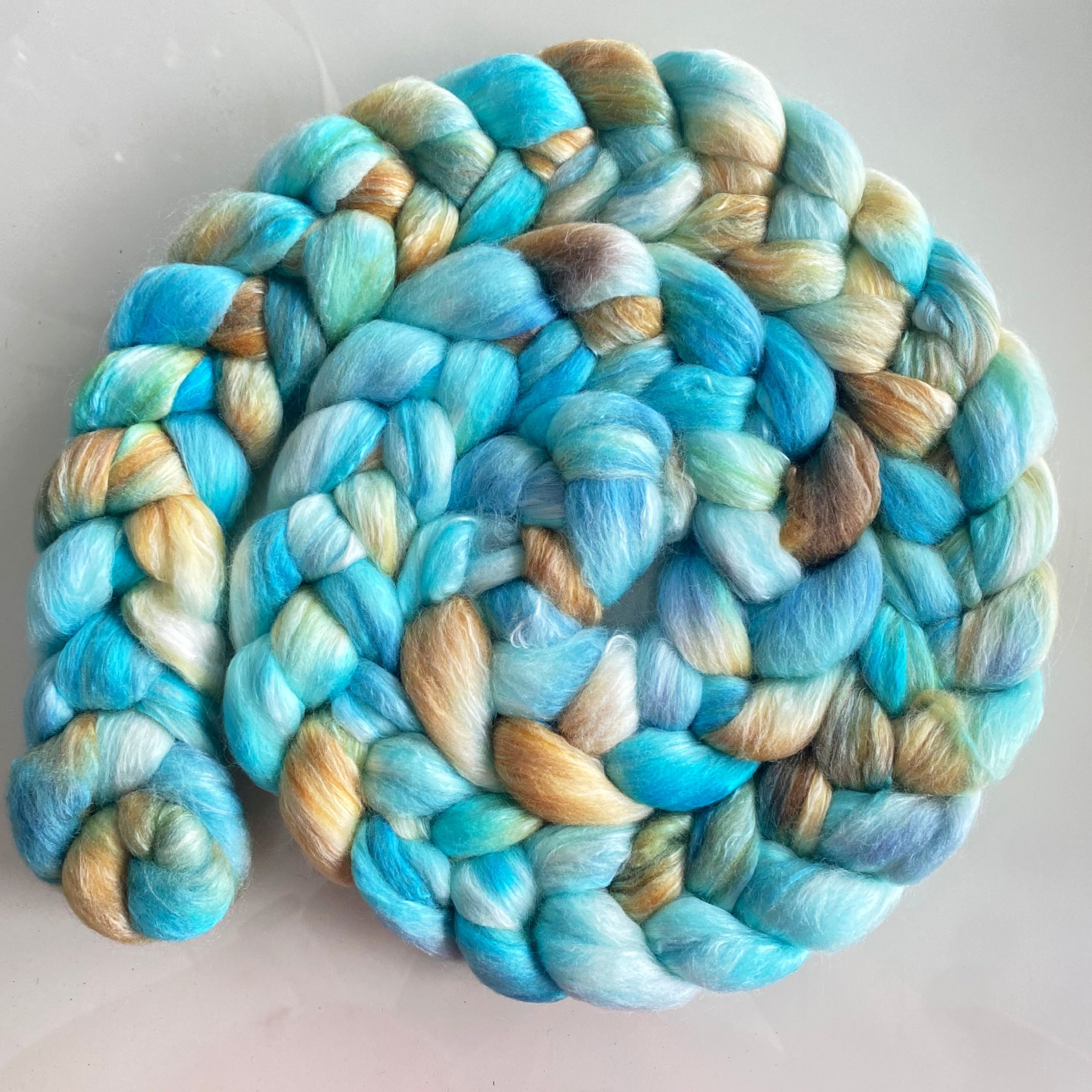 Hand dyed roving in robin’s egg shades of blue, brown and eggshell. Hand dyed on a luxury merino and silk blend for the warmth of wool with a touch of silky shimmer. You can choose to spin this roving as is for a yarn with a long organic color changes or split it lengthwise before spinning for multiple shorter color repeats. This fiber also felts very well and makes easy and exceptional nuno-felted scarves with character and sheen with all the colors built right in. All dyes have been heat set for color fastness and the roving has been “refloofed” after dyeing for ease of drafting.