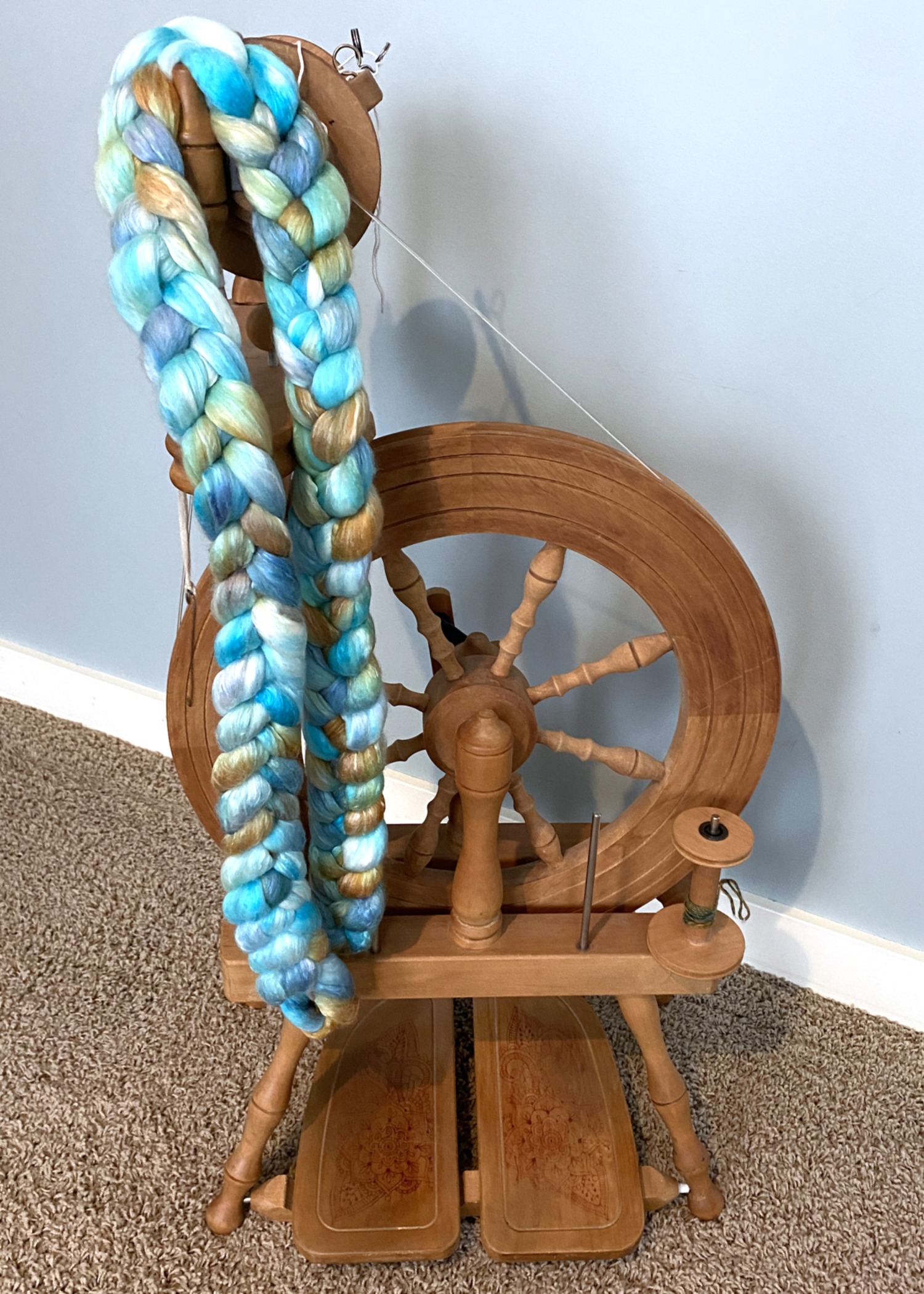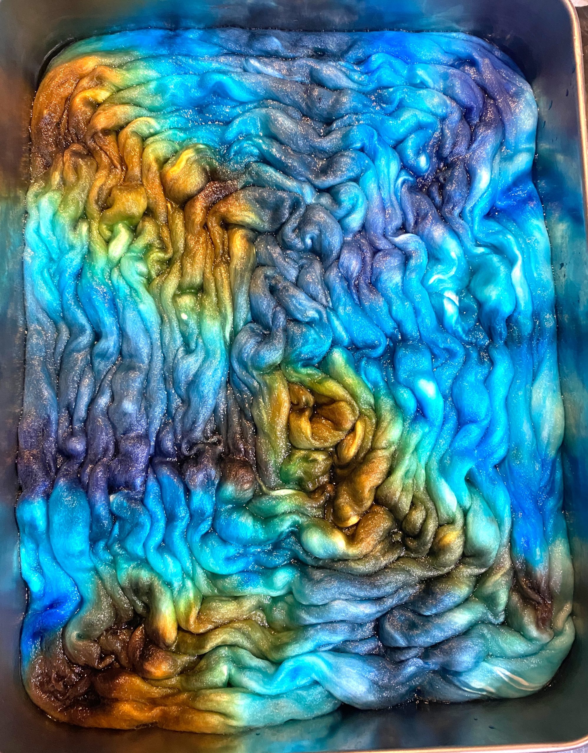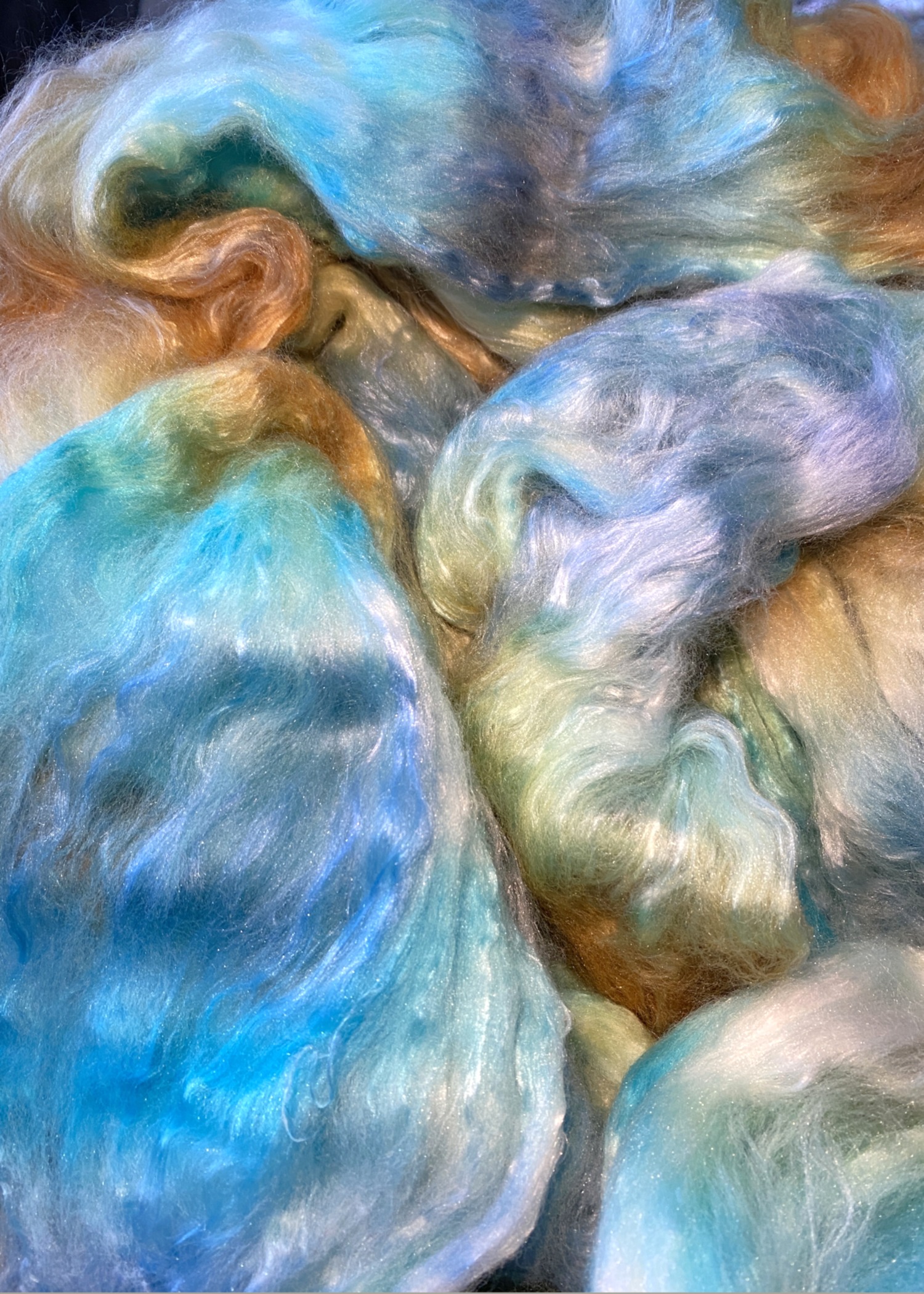 Hand dyed roving in robin’s egg shades of blue, brown and eggshell. Hand dyed on a luxury merino and silk blend for the warmth of wool with a touch of silky shimmer. You can choose to spin this roving as is for a yarn with a long organic color changes or split it lengthwise before spinning for multiple shorter color repeats. This fiber also felts very well and makes easy and exceptional nuno-felted scarves with character and sheen with all the colors built right in. All dyes have been heat set for color fastness and the roving has been “refloofed” after dyeing for ease of drafting.