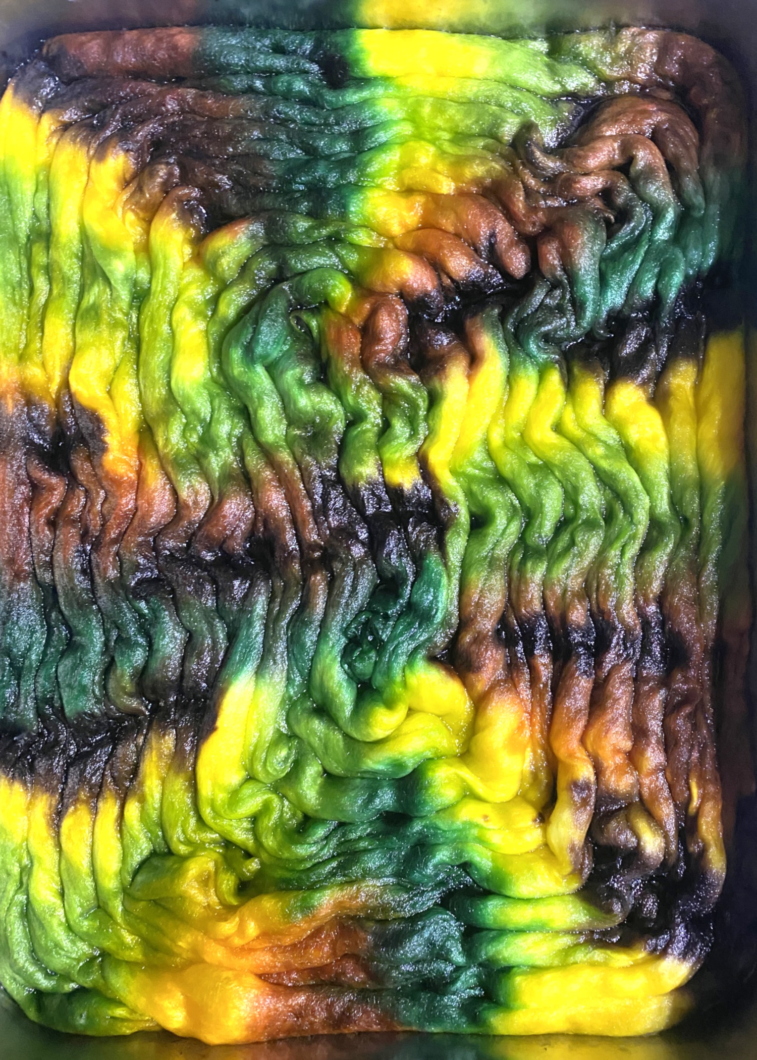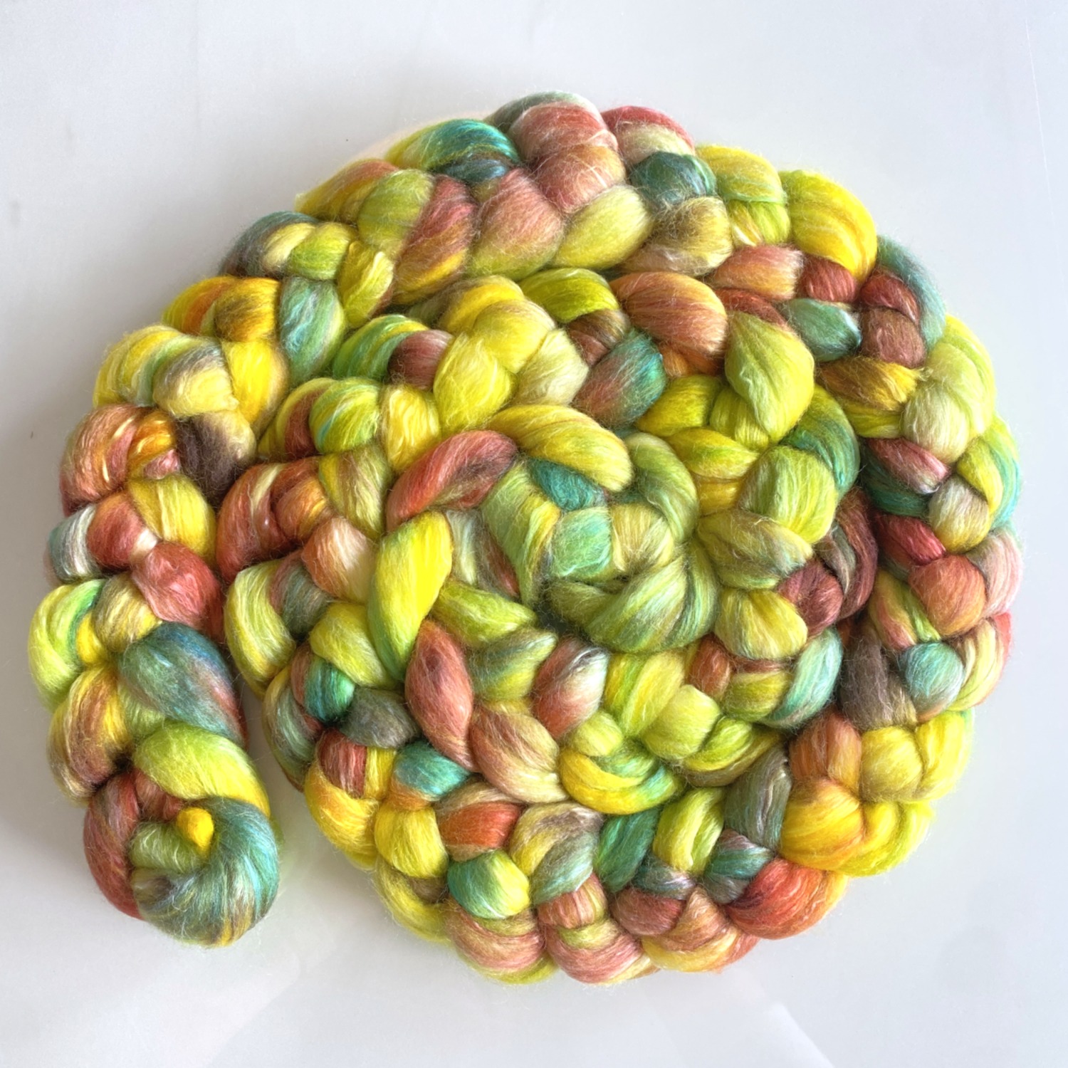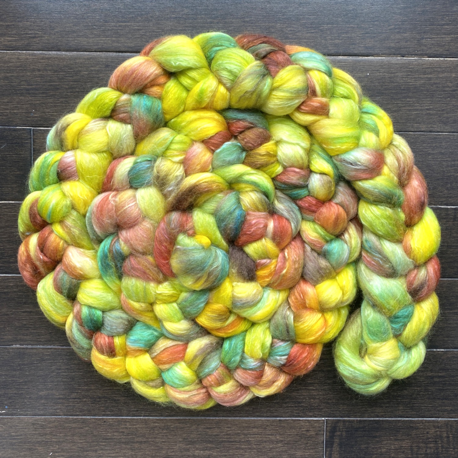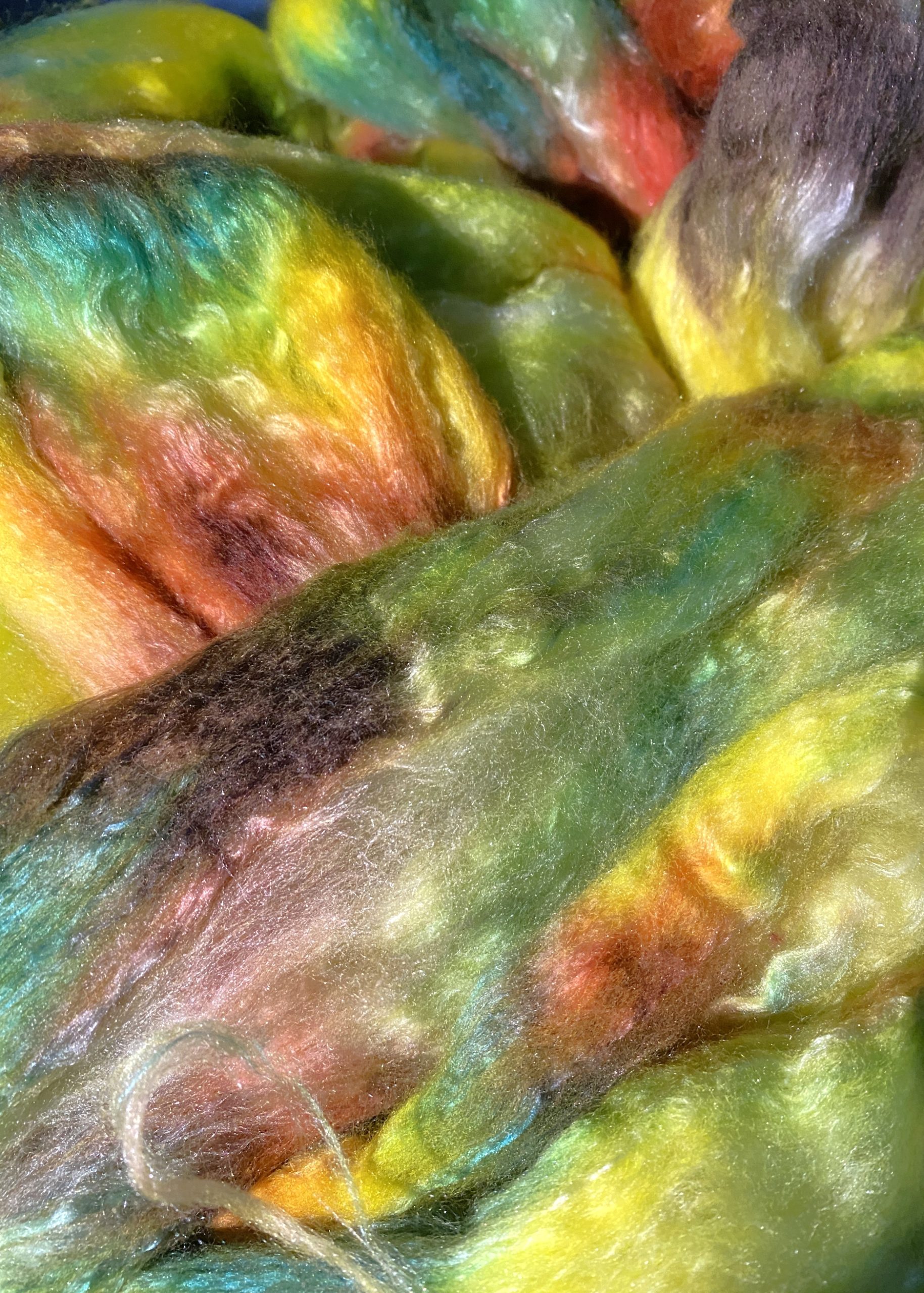A rich and bright blend of sunflower yellow and leafy green. This colorway has been hand dyed on a luxury merino and silk blend for the warmth of wool with a touch of silky shimmer. You can choose to spin this roving as is for a yarn with a long organic color changes or split it lengthwise before spinning for multiple shorter color repeats. This fiber also felts very well and makes easy and exceptional nuno-felted scarves with character and sheen with all the colors built right in. All dyes have been heat set for color fastness and the roving has been “refloofed” after dyeing for ease of drafting.