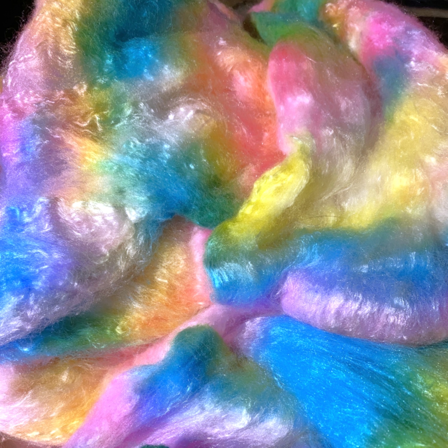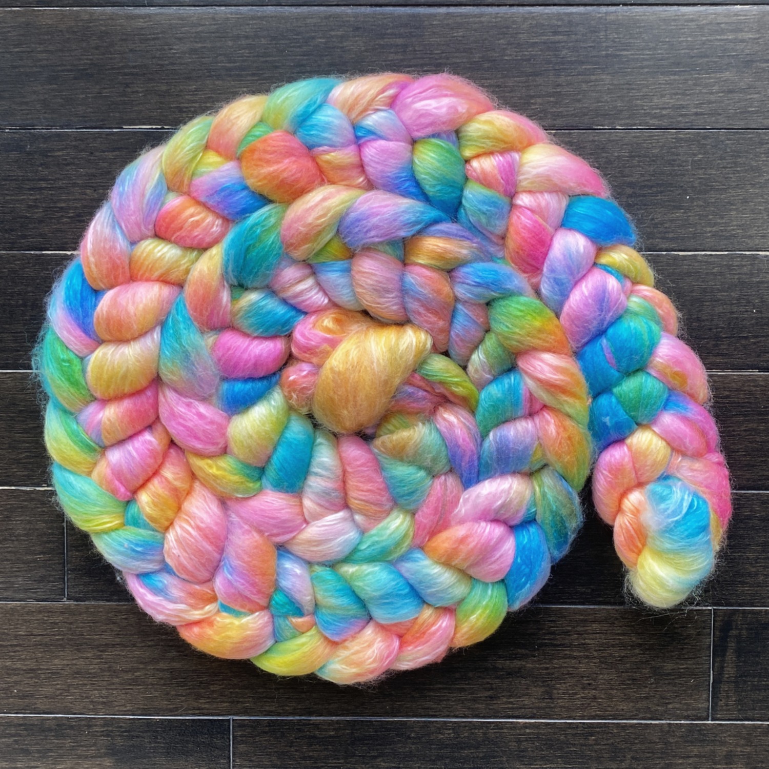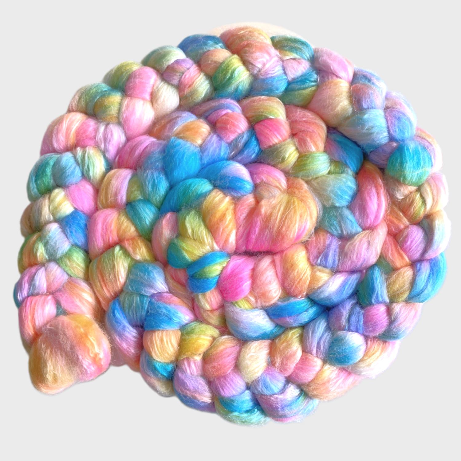 A happy and bright rainbow in juicy tropical hues. This colorway has been hand dyed on a luxury merino and silk blend for the warmth of wool with a touch of silky shimmer.  You can choose to spin this roving as is for a yarn with a long organic color changes or split it lengthwise before spinning for multiple shorter color repeats.  This fiber also felts very well and makes easy and exceptional nuno-felted scarves with character and sheen with all the colors built right in. All dyes have been heat set for color fastness and the roving has been “refloofed” after dyeing for ease of drafting.