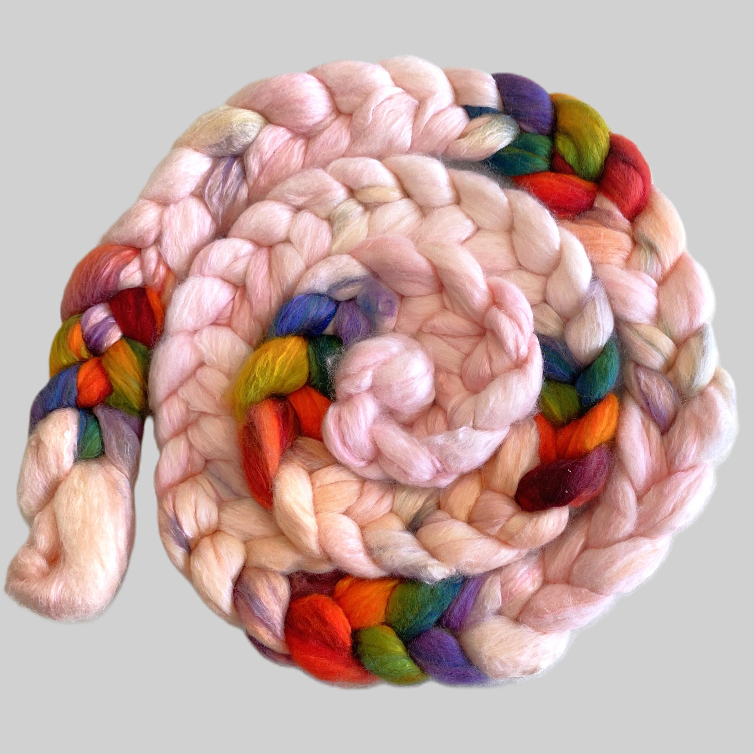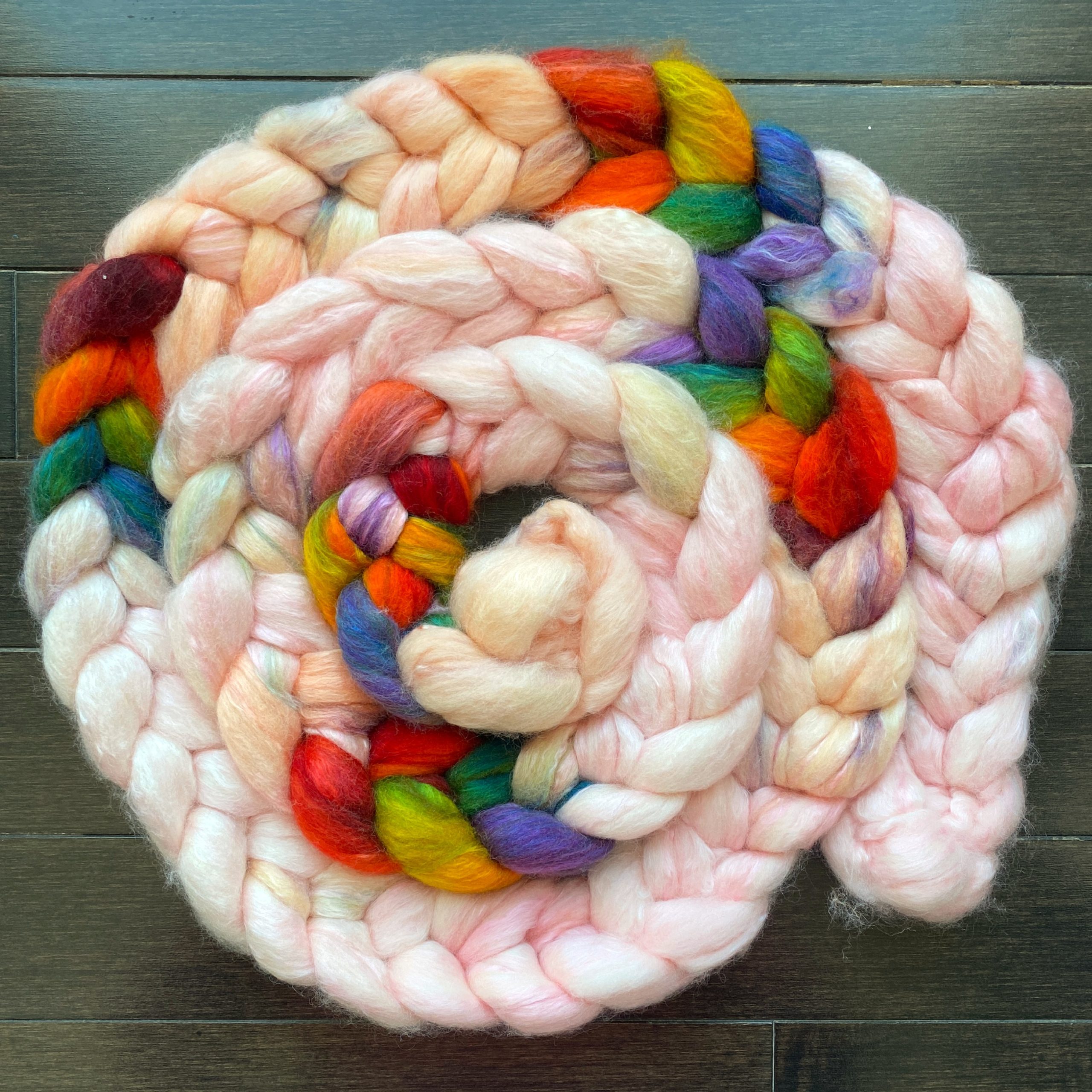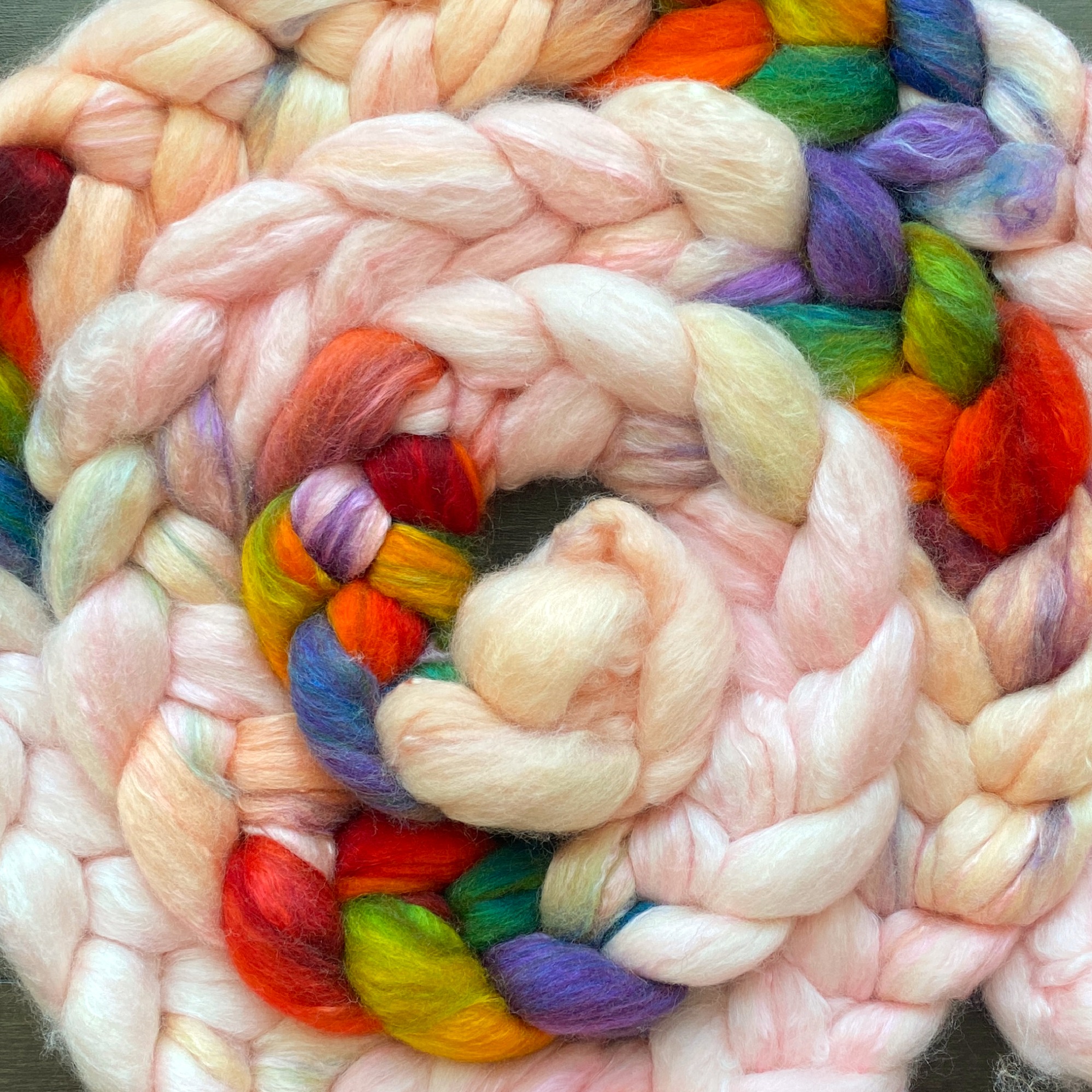 A warm variation of the rainbows in the mist theme with a soft peachy tint. This colorway has been hand dyed on a luxury merino and silk blend for the warmth of wool with a touch of silky shimmer. You can choose to spin this roving as is for a yarn with a long organic color changes or split it lengthwise before spinning for multiple shorter color repeats. This fiber also felts very well and makes easy and exceptional nuno-felted scarves with character and sheen with all the colors built right in. All dyes have been heat set for color fastness and the roving has been “refloofed” after dyeing for ease of drafting.