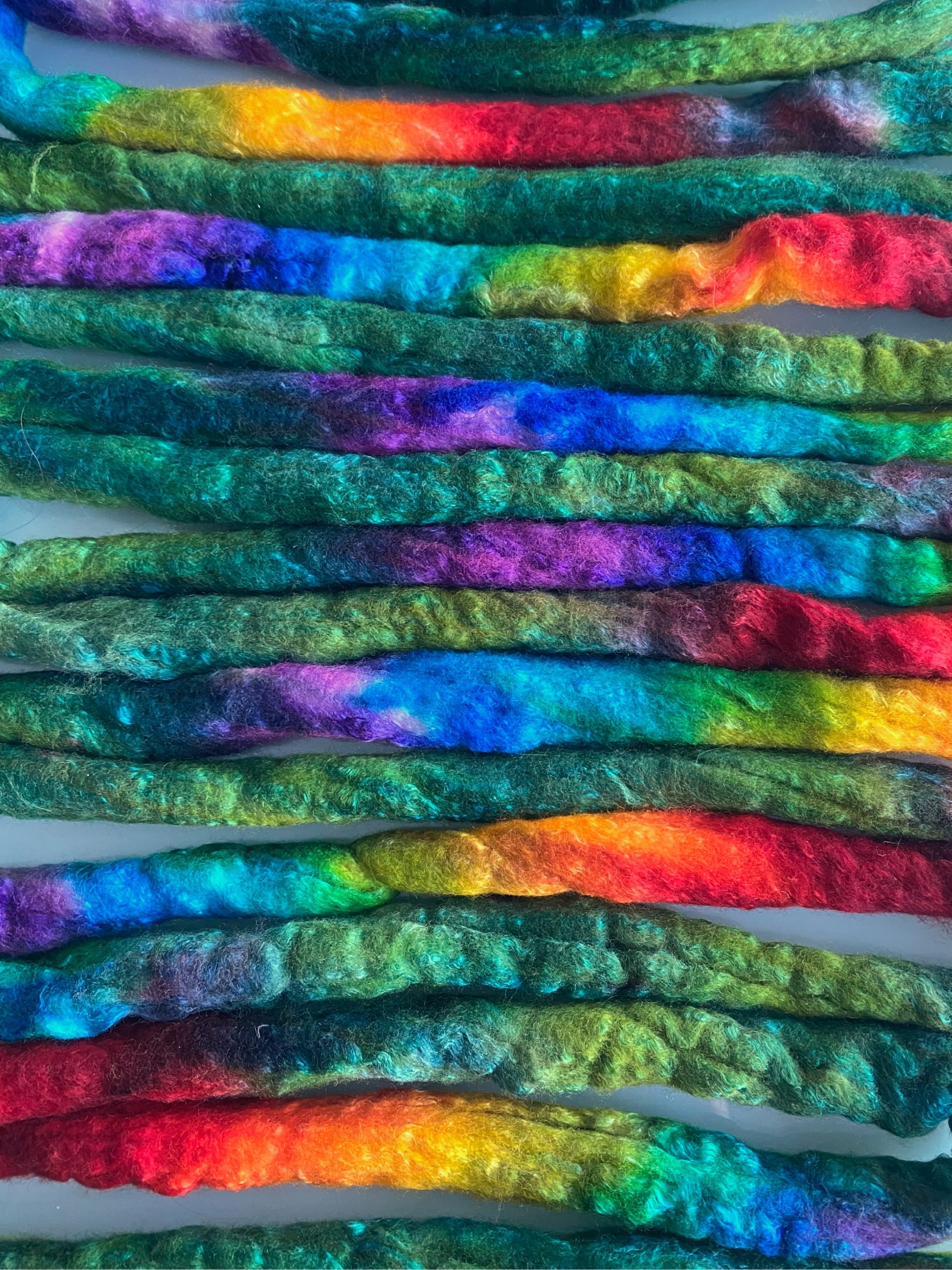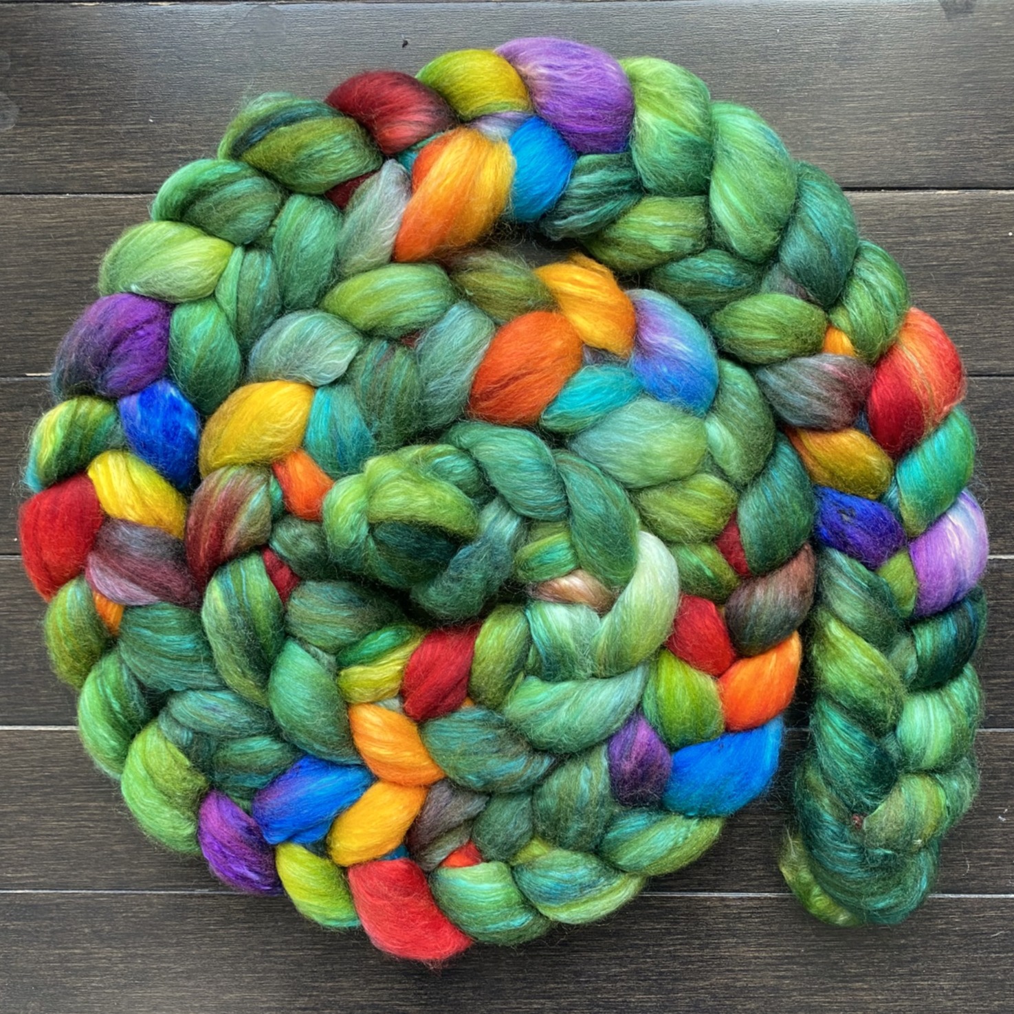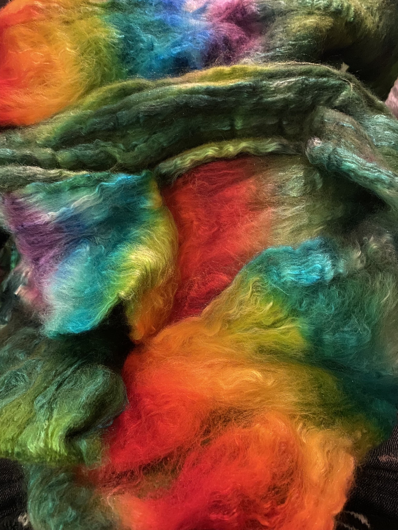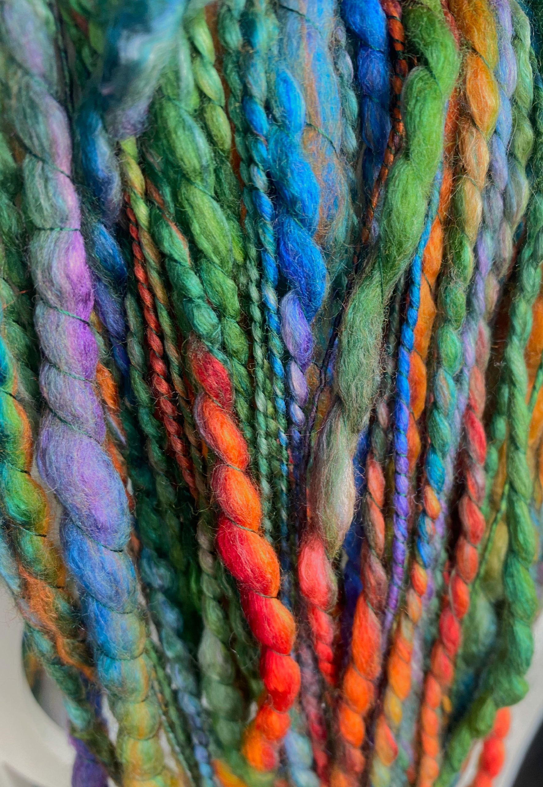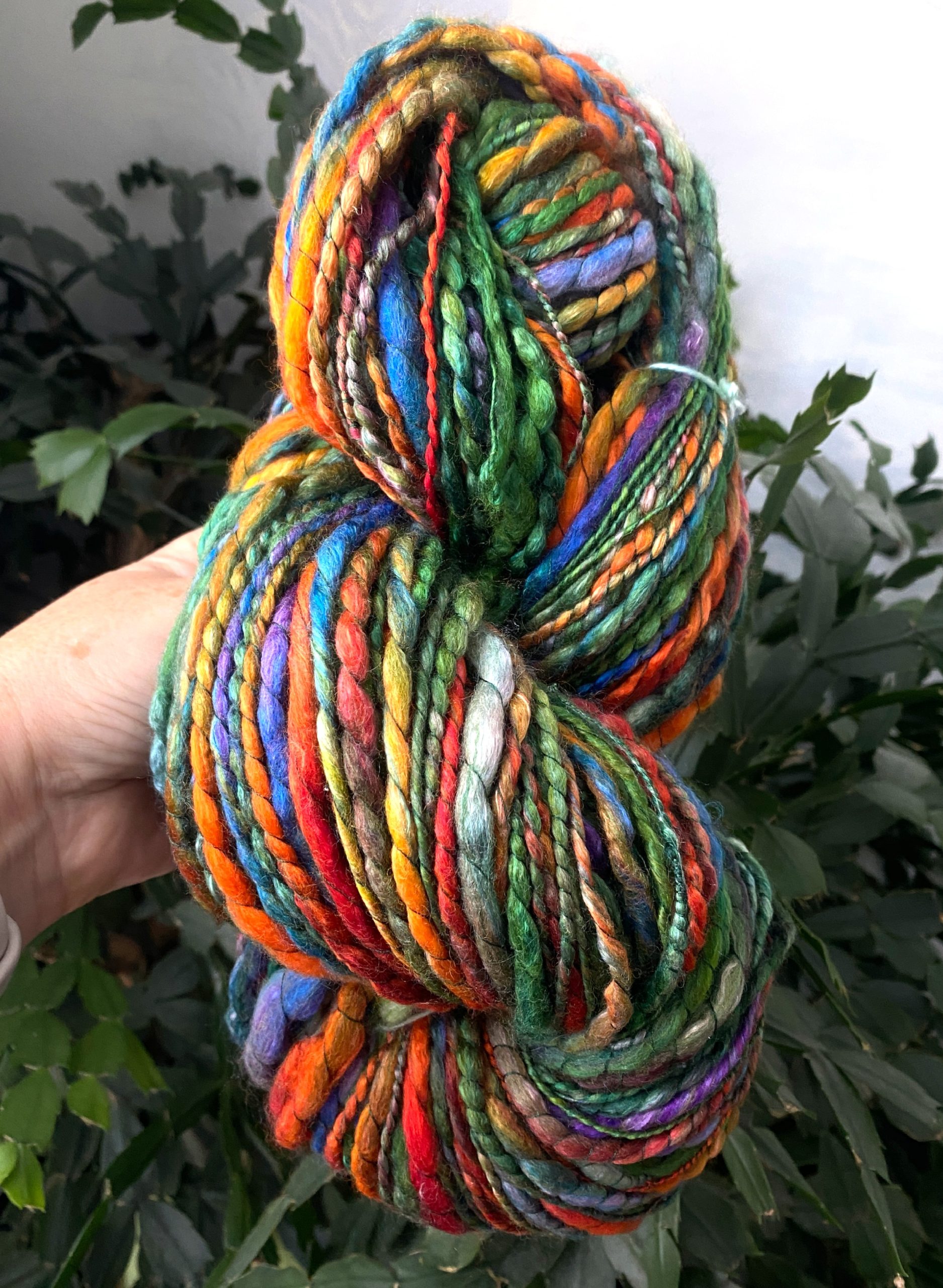 A St. Patrick’s day inspired colorway with bright traditional rainbow sections anchored against a base of rich shamrock emerald. It is spun from a luxury merino wool and silk blend that has been thread plied with a high quality viscose thread with some shimmer that enhances the color blend. This yarn is so much fun to knit and weave with and gives textiles great texture and character. I’ve used this style of yarn for both warp and weft and it holds up nicely.