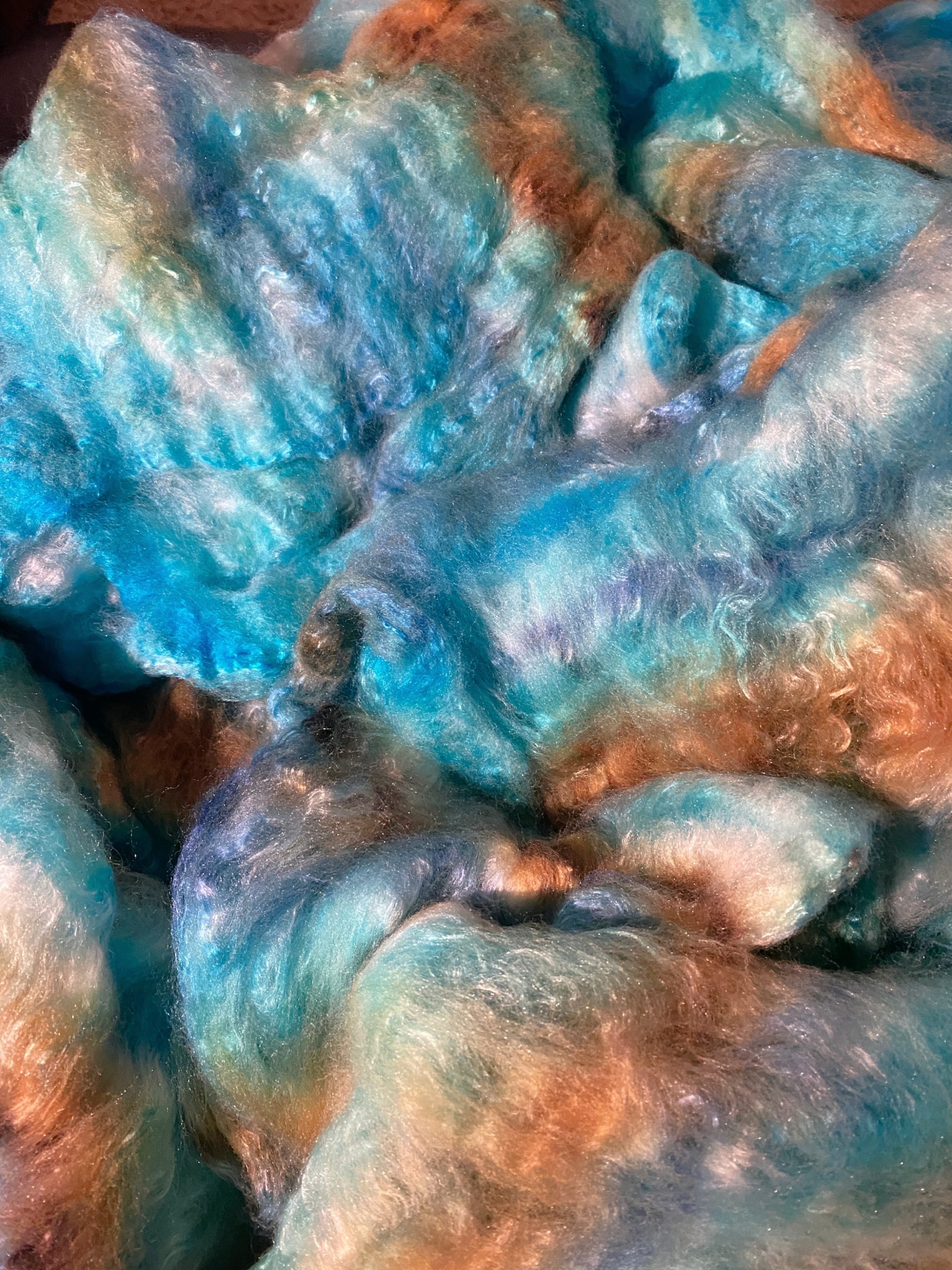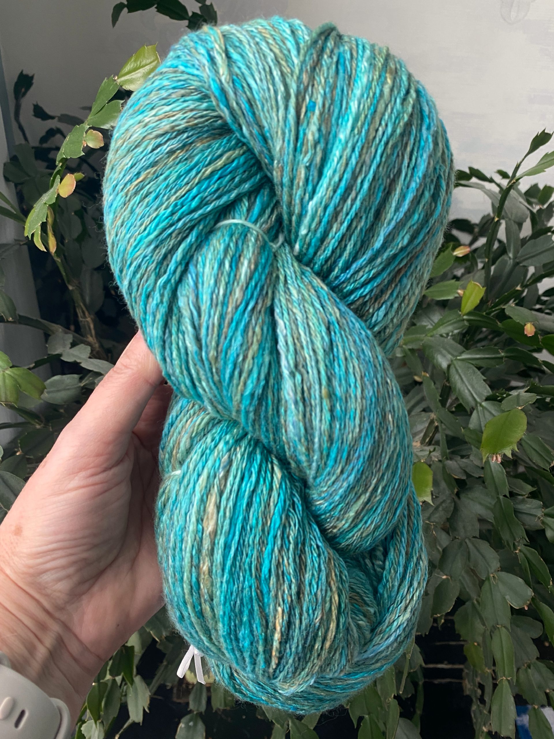 This yarn is a blend of 70% fine merino and 30% silk that has been hand dyed and hand spun . It is a light and lofty three strand chain ply that gives a nice flow to the color definition. This yarn is a moderately fine 16-17 wpi weight suitable for use in your favorite scarf, cowl, hat or mitten pattern.