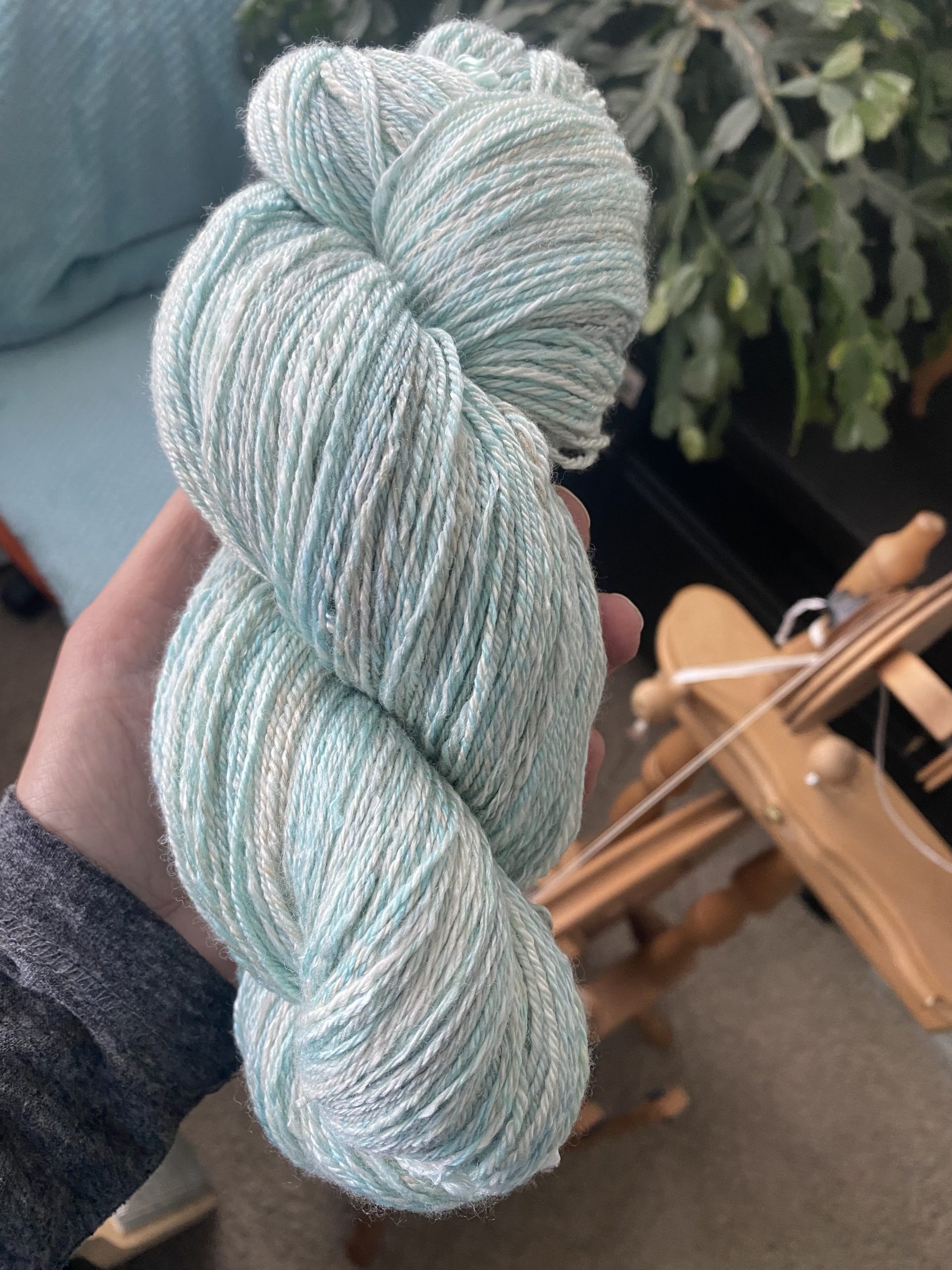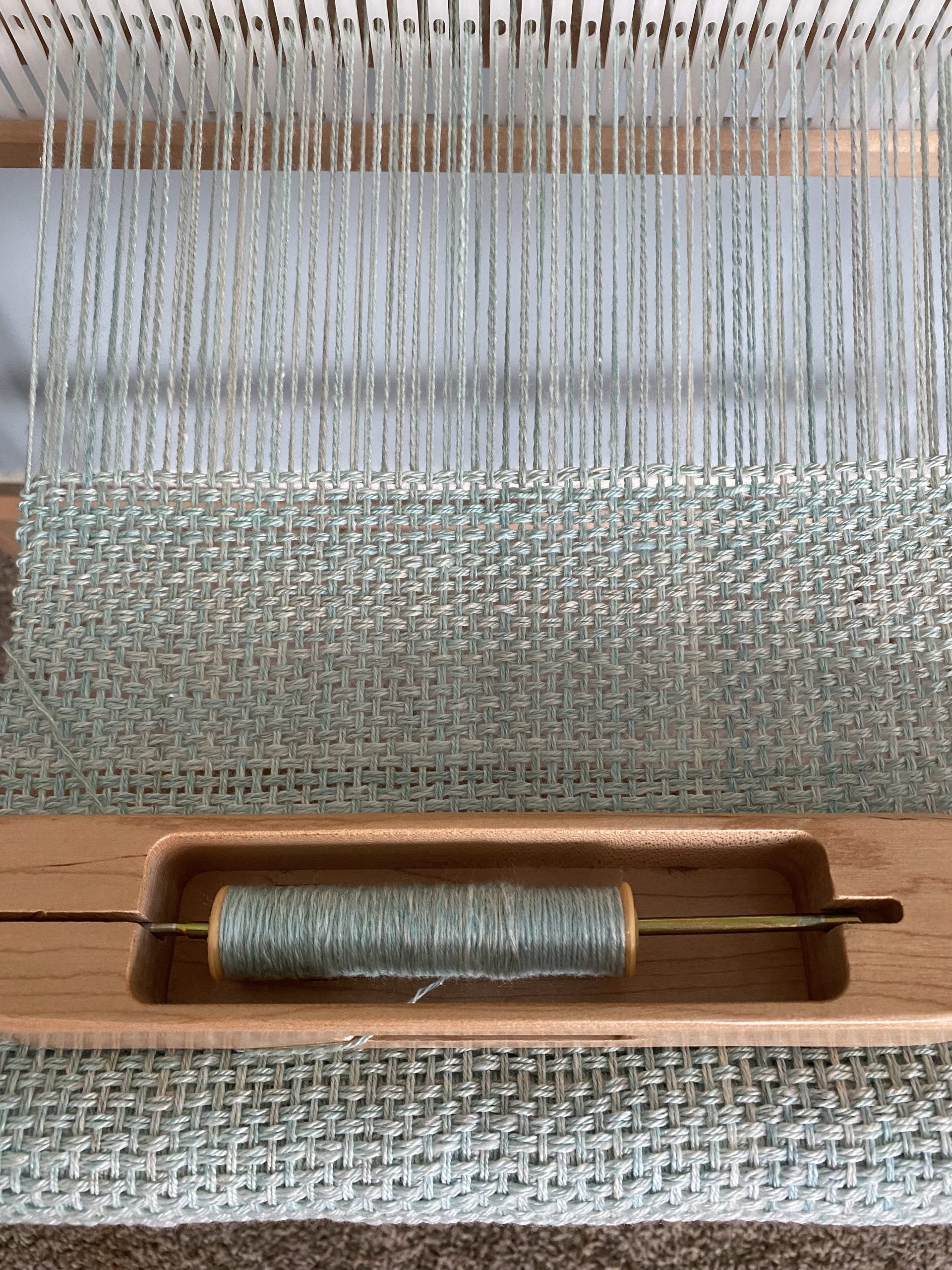 This scarf is handwoven using my own hand-dyed and handspun 70/30 Merino/silk yarn in a beautiful blend of eggshell, robin’s egg blue and a touch of brown. With all natural fibres, merino wool to give warmth and silk to add a beautiful sheen. Woven in a double strand basketweave for warmth and gorgeous texture, it is one of a kind apparel and is perfect for gifting!